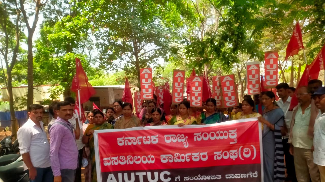 ಸರ್ಕಾರದ ವಿವಿಧ ಇಲಾಖೆಗಳು ಹಾಗೂ ವಸತಿ ಶಾಲೆಗಳಲ್ಲಿ ಹೊರಗುತ್ತಿಗೆಯ ಅಡುಗೆಯವರು, ಅಡುಗೆ ಸಹಾಯಕರು ಹಾಗೂ ಸ್ವಚ್ಛತಾ ಸಿಬ್ಬಂದಿಯಾಗಿ ಕಾರ್ಯನಿರ್ವಹಿಸುತ್ತಿರುವ ನೌಕರರಿಗೆ ಸರ್ಕಾರದ ನಿಗದಿಂದ ಕನಿಷ್ಠ ವೇತನ ಪಾವತಿಸಲು ತಕ್ಷಣ ನಿರ್ದೇಶನ ನೀಡುವುದು ಸೇರಿದಂತೆ ವಿವಿಧ ಬೇಡಿಕೆಗಳನ್ನು ಈಡೇರಿಸುವಂತೆ ಒತ್ತಾಯಿಸಿ ಸೋಮವಾರ ಕರ್ನಾಟಕ ರಾಜ್ಯ ಸಂಯುಕ್ತ ವಸತಿ ನಿಲಯ ಕಾರ್ಮಿಕರ ಸಂಘ ಎಐಯುಟಿಯುಸಿ ಜಿಲ್ಲಾ ಘಟಕದಿಂದ ನಗರದಲ್ಲಿ ಪ್ರತಿಭಟಿಸಲಾಯಿತು.