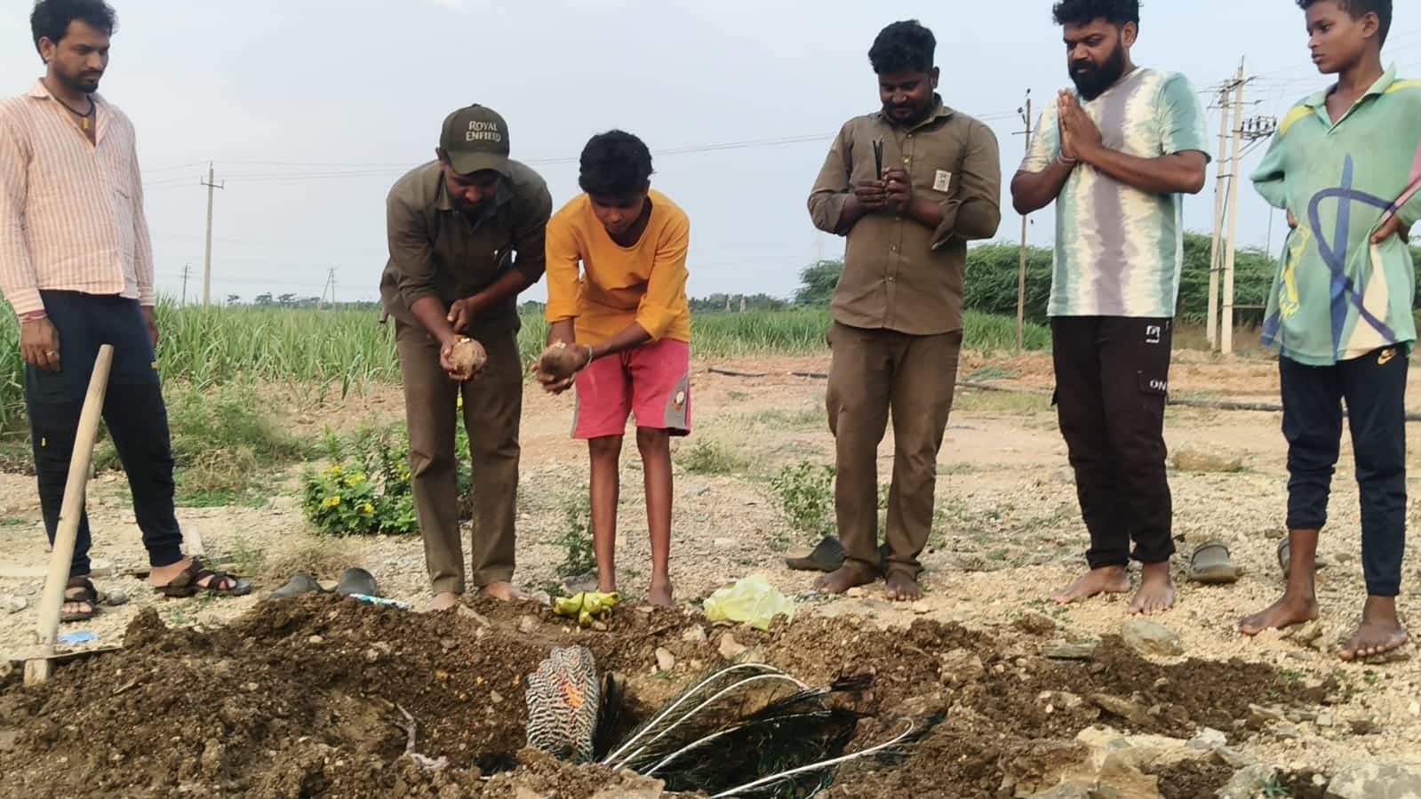 ದೇವಸ್ಥಾನದ ಎದುರಿಗೆ ಜಮೀನೊಂದರ ಜೋಡು ವಿದ್ಯುತ್ ಕಂಬಕ್ಕೆ ತಗುಲಿ ಕಂಬದ ಮೇಲೆಯೆ ನವಿಲು ಪ್ರಾಣ ಬಿಟ್ಟಿತ್ತು. ಇದರಿಂದಾಗಿ ಲೈನ್ ಟ್ರಿಪ್ ಆಗುವ ವಿಚಾರವಾಗಿ ಲೈನ್ ತೊಂದರೆ ಬಗ್ಗೆ ಲೈನ್ಮ್ಯಾನ್ಗಳಾದ ಸಂಗಮೇಶ ಕೋಟಿಕಲ್ ಹಾಗೂ ಚೇತನ್ ಬಳ್ಳಾರಿ ಲೈನ್ ಫಾಲ್ಟ್ ನೋಡುವಾಗ ನವಿಲು ವಿದ್ಯುತ್ ತಗುಲಿ ಮೃತಪಟ್ಟಿರುವುದು ಕಂಡುಬಂದಿದೆ.ತಕ್ಷಣವೆ ಲೈನ್ಮ್ಯಾನ್ಗಳಿಬ್ಬರೂ ನವಿಲನ್ನು ವಿದ್ಯುತ್ ಕಂಬದಿಂದ ಕಳೆಗಿಳಿಸಿ ಪಕ್ಕದಲ್ಲಿರುವ ಜಮೀನೊಂದರಲ್ಲಿ ತಾವೇ ಸ್ವತಃ ತೆಗ್ಗು ತೋಡಿ ಗ್ರಾಮಸ್ಥರ ಸಹಕಾರದಿಂದ ಅಂತಿಮ ಪೂಜೆ ಸಲ್ಲಿಸಿ, ಅಂತ್ಯಕ್ರಿಯೆ ನೆರವೇರಿಸಿದರು.