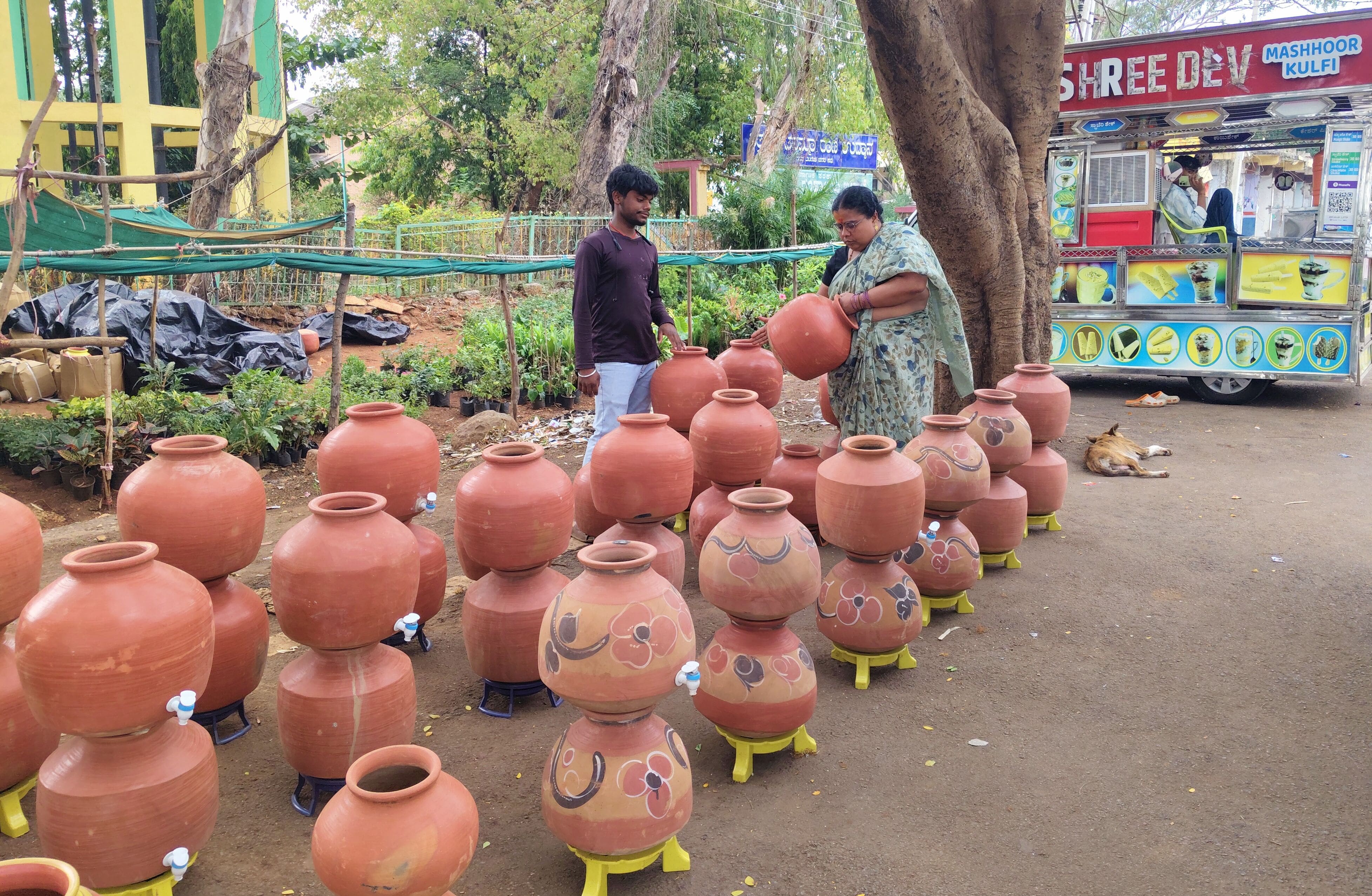 ಮಣ್ಣಿನ ಮಡಕೆಗೆ ಹೆಚ್ಚಿದ ಬೇಡಿಕೆ: ಬಡವರ ಫ್ರೀಜ್ ಎಂದೇ ಕರೆಯುವ ಮಣ್ಣಿನ ಮಡಕೆಗೆ ನಗರದಲ್ಲಿ ಬೇಡಿಕೆ ಹೆಚ್ಚಾಗಿದ್ದು, ಬೇಸಿಗೆ ಬಿಸಿಲಿನ ನಡುವೆ ನೈಸರ್ಗಿಕವಾದ ತಂಪು ನೀರು ಕುಡಿಯುವುದಕ್ಕಾಗಿ ಜನ ಹಾತೊರೆಯುತ್ತಿದ್ದು, ಮಣ್ಣಿನ ಮಡಕೆಗಳತ್ತ ಮುಖ ಮಾಡಿದ್ದಾರೆ. ಬೇಡಿಕೆ ಹೆಚ್ಚಾದಂತೆ ಸಾಮಾನ್ಯವಾಗಿ ಮಡಕೆಗಳ ಬೆಲೆಯೂ ಹೆಚ್ಚಾಗಿದೆ. ನೀರಿನ ಕ್ಯಾನ್ಗಳಂತೆ ಮಣ್ಣಿನ ಮಡಕೆಗಳಿಗೆ ನಲ್ಲಿಗಳನ್ನು ಅಳವಡಿಸಿದ್ದು, ಅವುಗಳ ಗಾತ್ರಕ್ಕೆ ತಕ್ಕಂತೆ ಮಣ್ಣಿನ ಮಡಕೆ ವ್ಯಾಪಾರಿಗಳು ಬೆಲೆ ನಿಗದಿ ಮಾಡಿದ್ದಾರೆ. 450-650ರ ವರೆಗೆ ಮಣ್ಣಿನ ಮಡಕೆಗಳ ಬೆಲೆಯಿದ್ದು, ಬೇಸಿಗೆ ದಿನಗಳಲ್ಲಿ ಮಾರಾಟ ಉತ್ತಮವಾಗಿ ನಡೆದಿದೆ ಎನ್ನುತ್ತಾರೆ ವ್ಯಾಪಾರಿಗಳು.ಓಡಾಟ ಅನಿವಾರ್ಯ: ಕಳೆದ ಒಂದು ವಾರದಿಂದ ತಾಪಮಾನ ಏರಿಕೆಯಾಗುತ್ತಿದೆ. ಮನೆಯಿಂದ ಹೊರಬಾರದಂತಹ ಸ್ಥಿತಿ ಇದ್ದರೂ ಅನಿವಾರ್ಯವಾಗಿ ಸರ್ಕಾರಿ ಕಚೇರಿ, ಅಂಗಡಿ- ಮುಂಗಟ್ಟುಗಳಿಗೆ ಆಗಮಿಸುವ ಜನರು ಜನರು ಬಿಸಿಲಿನ ಝಳಕ್ಕೆ ತತ್ತರಿಸಿ, ಬೆವರಿಳಿದು ಮೆತ್ತಗಾಗುತ್ತಿದ್ದಾರೆ. ಬಿಸಿಲಿನ ಹೊಡೆತ ತಾಳದೆ ಮನೆ, ಕಚೇರಿ ಬಿಟ್ಟು ಹೊರಬರಲು ಹಿಂಜರಿಕೆಯಾದರೂ ಕೆಲಸ- ಕಾರ್ಯಗಳ ನಿಮಿತ್ತ ಓಡಾಟ ಅನಿವಾರ್ಯ ಎನಿಸಿದೆ.