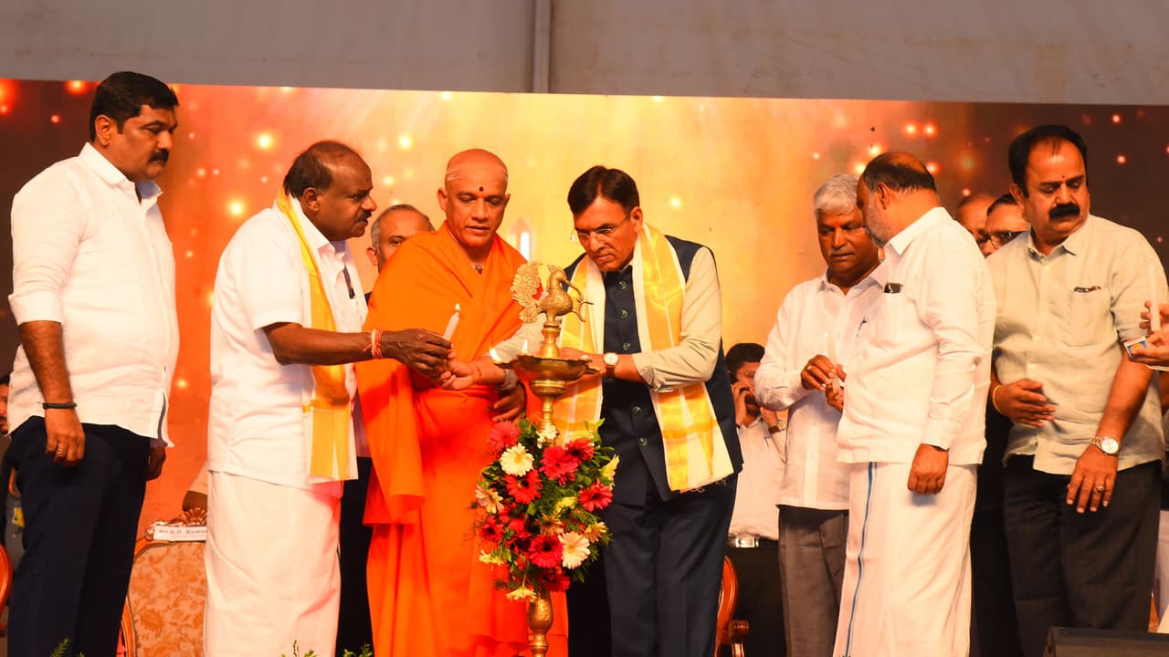 ವಿಕಲಚೇತನರಿಗೆ ಎಲೆಕ್ಟ್ರಿಕ್ ವಾಹನಗಳನ್ನು ಹಸ್ತಾಂತರಿಸುವ ಸಂದರ್ಭದಲ್ಲಿ ಸಚಿವ ಕುಮಾರಸ್ವಾಮಿ ಅವರು ಭಾವೋದ್ವೇಗಕ್ಕೆ ಒಳಗಾದರು. ವಾಹನಗಳನ್ನು ಸ್ವೀಕರಿಸುತ್ತಿದ್ದ ವಿಕಲಚೇತನರು ತಮಗೇ ಕೃತಜ್ಞತೆ ಹೇಳುವಾಗ ಕಣ್ಣಲ್ಲಿ ನೀರು ತಂಬಿಕೊಂಡ ಸಚಿವರು, ಇಷ್ಟು ದೂರ ಬಂದು ವಾಹನಗಳನ್ನು ಸ್ವೀಕರಿದ್ದಕ್ಕಾಗಿ ಎಲ್ಲರಿಗೂ ಧನ್ಯವಾದ ಸಲ್ಲಿಸಿದರು.ಬೃಹತ್ ಬೆಲ್ಲದ ಹಾರ ಹಾಕಿ ಸ್ವಾಗತಿಸಿದ ಅಭಿಮಾನಿಗಳುಒಳಾಂಗಣ ಕ್ರೀಡಾಂಗಣಕ್ಕೆ ಭೂಮಿಪೂಜೆ ನೆರವೇರಿಸಿದ ನಂತರ ಕೇಂದ್ರದ ಇಬ್ಬರೂ ಸಚಿವರನ್ನು ವೇದಿಕೆಯ ಕಾರ್ಯಕ್ರಮಕ್ಕೆ ತೆರೆದ ವಾಹನದಲ್ಲಿ ಮೆರವಣಿಗೆ ಮೂಲಕ ಕರೆತರಲಾಯಿತು. ವಿ.ಸಿ.ಫಾರಂ ಗೇಟ್ನಲ್ಲಿ ಬೃಹತ್ ಬೆಲ್ಲದ ಹರವನ್ನು ಹಾರ ಬರಮಾಡಿಕೊಳ್ಳಲಾಯಿತು. ಇಷ್ಟೊಂದು ದೊಡ್ಡ ಪ್ರಮಾಣದ ಬೆಲ್ಲದ ಹಾರದ ಮೂಲಕ ಸಿಕ್ಕಿದ ಸ್ವಾಗತವನ್ನು ಕಂಡು ಮಾಂಡವೀಯ ಅವರು ಚಕಿತರಾದರು. ಮಂಡ್ಯದ ಬೆಲ್ಲದ ಶ್ರೇಷ್ಠತೆಯ ಬಗ್ಗೆ ಕುಮಾರಸ್ವಾಮಿ ಅವರು ಮಾಂಡವೀಯ ಅವರಿಗೆ ವಿವರಣೆ ನೀಡಿದರು.