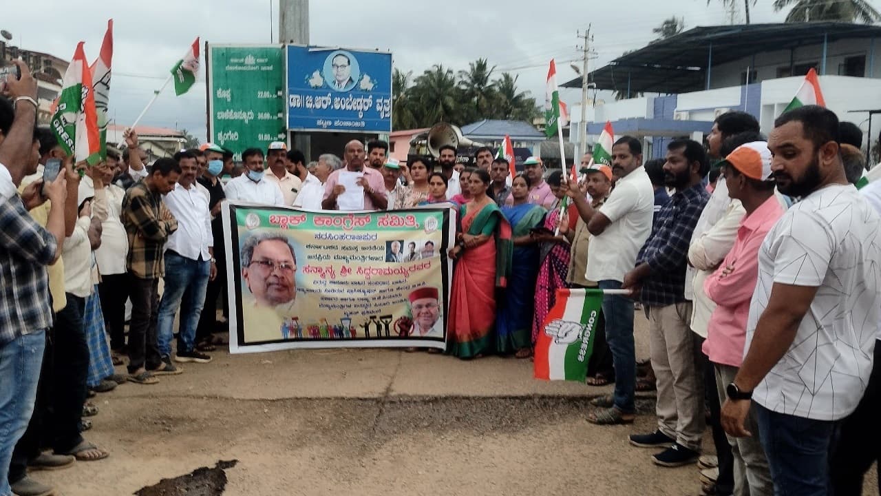 ಅಂಬೇಡ್ಕರ್ ವೃತ್ತದಲ್ಲಿ ಕಾಂಗ್ರೆಸ್ ಪ್ರತಿಭಟನೆ । ಮಾನವ ಸರಪಳಿ- ಟೈರ್ ಸುಟ್ಟು ಆಕ್ರೋಶ