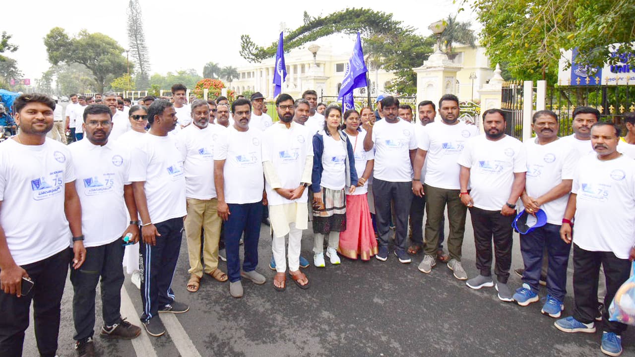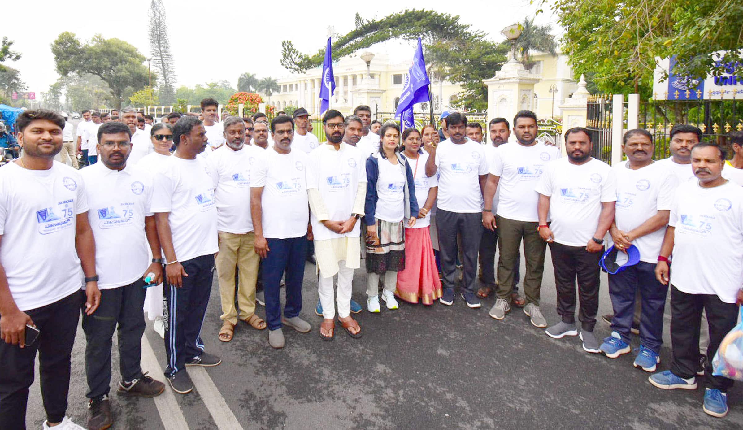 ಸಂವಿಧಾನ ಜಾರಿಗೆ ಬಂದು 75 ವರ್ಷಗಳಾದ ವಿಶೇಷವಾಗಿ ಭೀಮ ಬಲ ಬಳಗವು ಭಾನುವಾರ ಸಂವಿಧಾನ ಸಂಭ್ರಮದ ನಡಿಗೆ ಶೀರ್ಷಿಕೆಯಲ್ಲಿ ವಾಕಾಥಾನ್ ಆಯೋಜಿಸಿತ್ತು.ಮೈಸೂರು ವಿವಿ ಕ್ರಾಫರ್ಡ್ ಭವನ ಮುಂಭಾಗದ ನಾಲ್ವಡಿ ಕೃಷ್ಣರಾಜ ಒಡೆಯರ್ ಅವರ ಪ್ರತಿಮೆಗೆ ಪುಷ್ಪಾರ್ಚನೆ ಮಾಡುವ ಮೂಲಕ ಆರಂಭವಾದ ವಾಕಾಥಾನ್ ಗೆ ಮೈಸೂರು ವಿವಿ ವಿದ್ಯಾರ್ಥಿ ಕ್ಷೇಮಪಾಲನ ನಿರ್ದೇಶನಾಲಯ ನಿರ್ದೇಶಕ ಗುರುಸಿದ್ದಯ್ಯ, ಸಿಂಡಿಕೇಟ್ ಮಾಜಿ ಸದಸ್ಯ ಶರತ್ ಸತೀಶ್, ಜಿಲ್ಲಾ ಪತ್ರಕರ್ತರ ಸಂಘದ ಅಧ್ಯಕ್ಷ ಕೆ. ದೀಪಕ್ ಅವರು ಚಾಲನೆ ನೀಡಿದರು.
