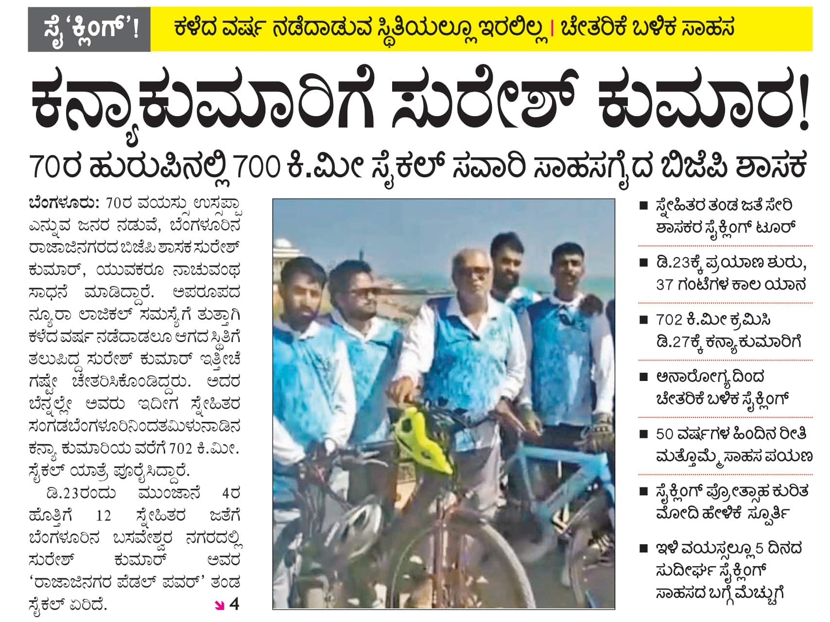 ಕನ್ಯಾಕುಮಾರಿಗೆ ಸೈಕಲ್ ಯಾತ್ರೆ ನಡೆಸಿದ ಶಾಸಕ ಸುರೇಶ್ ಕುಮಾರ್ ಬಗ್ಗೆ ‘ಕನ್ಯಾಕುಮಾರಿಗೆ ಸುರೇಶ್ ಕುಮಾರ’ ಹೆಸರಲ್ಲಿ ಕನ್ನಡಪ್ರಭ ಡಿ.31ರಂದು ವರದಿ ಮಾಡಿತ್ತು.--