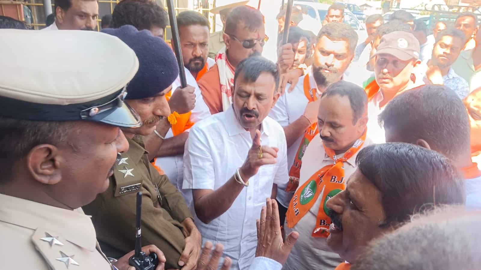 ಕಾರ್ಯಕರ್ತರು, ಪೊಲೀಸರ ನಡುವೆ ತಳ್ಳಾಟ ನೂಕಾಟ:ಮುಂಜಾಗ್ರತಾ ಕ್ರಮವಾಗಿ ನಗರದ ಪೊಲೀಸರು ಅಂಗಡಿ ಮುಂಗಟ್ಟುಗಳನ್ನ ಬಂದ್ ಮಾಡಿಸಿದ್ದರಿಂದ ಅನಾಹುತ ತಪ್ಪಿತು. ಇನ್ನೂ ಅಂಗಡಿಗೆ ನುಗ್ಗಲು ಯತ್ನಿಸಿದ ವೇಳೆ ಬಿಜೆಪಿ ಕಾರ್ಯಕರ್ತರು ಹಾಗೂ ಪೊಲೀಸರ ನಡುವೆ ತಳ್ಳಾಟ ನೂಕಾಟ ನಡೆಯಿತು. ಬಳಿಕ ಮತ್ತಷ್ಟು ಪೊಲೀಸರು ಸ್ಥಳಕ್ಕೆ ಧಾವಿಸಿ ಪರಿಸ್ಥಿತಿ ನಿಯಂತ್ರಣಕ್ಕೆ ತಂದರು.