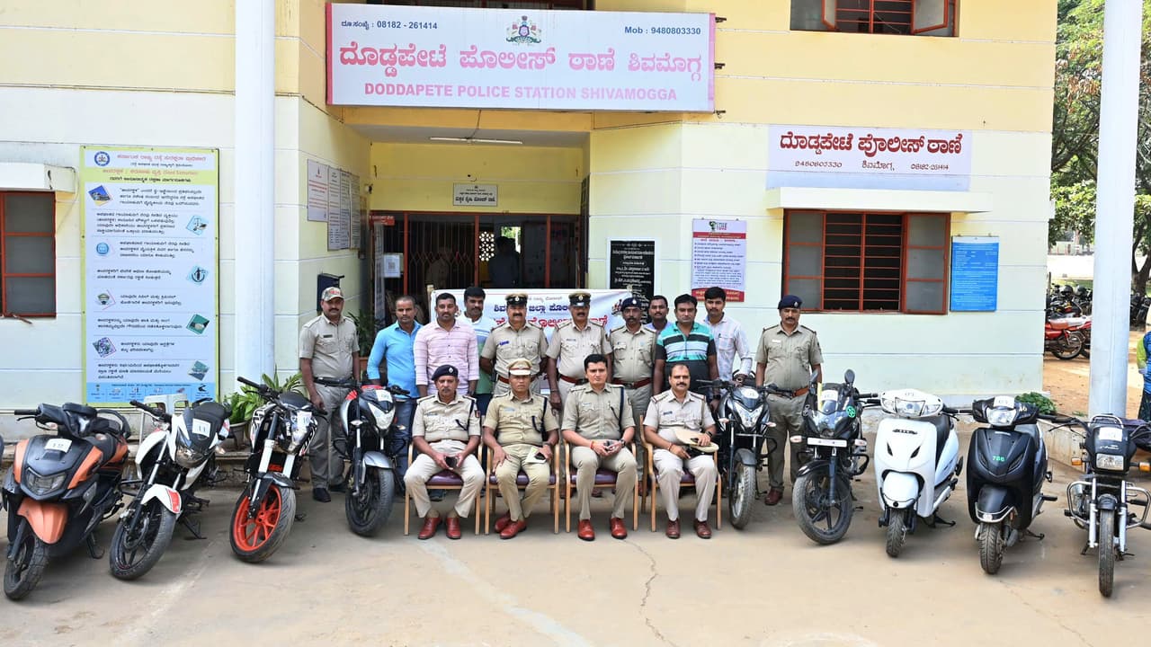 -12ಎಸ್ಎಂಜಿಕೆಪಿ06:ಶಿವಮೊಗ್ಗ ದೊಡ್ಡಪೇಟೆ ಪೊಲೀಸ್ ಠಾಣೆ ಪೊಲೀಸರು ಬಂಧಿಸಿದ ಬೈಕ್ ಕಳವು ಆರೋಪಿಯಿಂದ ವಶಕ್ಕೆ ಪಡೆದ ದ್ವಿಚಕ್ರ ವಾಹನಗಳು. ಎಸ್ಪಿ ಮಿಥುನ್ಕುಮಾರ್ ಇನ್ನಿತರ ಅಧಿಕಾರಿಗಳು-ಸಿಬ್ಬಂದಿ ಇದ್ದಾರೆ.