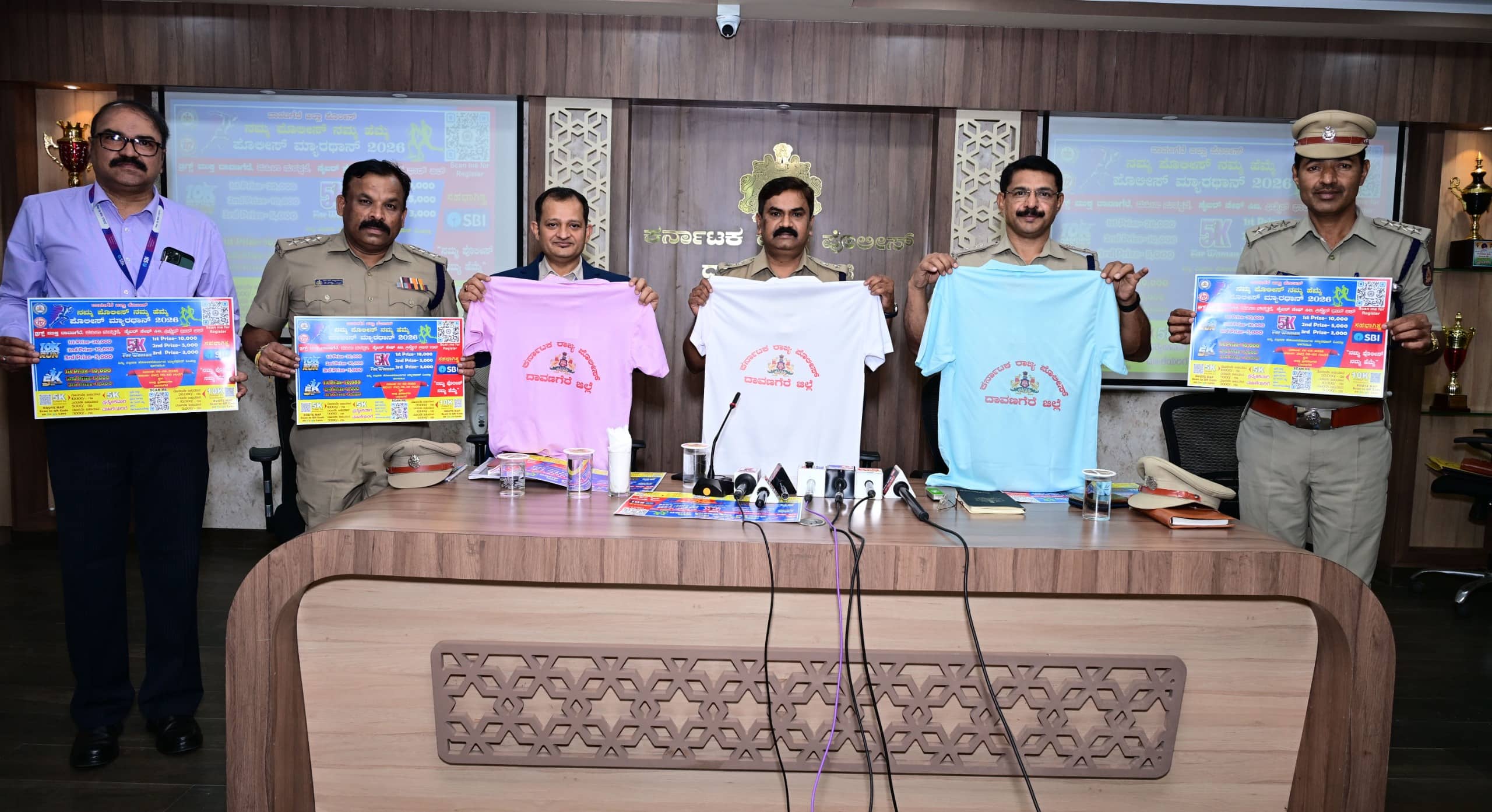 -27ಕೆಡಿವಿಜಿ8:ದಾವಣಗೆರೆ ಎಸ್ಪಿ ಕಚೇರಿಯಲ್ಲಿ ಶುಕ್ರವಾರ ಮ್ಯಾರಥಾನ್ ಓಟದ ಸ್ಪರ್ಧೆಯ ಟಿ ಶರ್ಟ್ಗಳನ್ನು ಎಸ್ಪಿ ಡಾ.ಎಚ್.ಟಿ.ಶೇಖರ್, ಎಎಸ್ಪಿ ಪರಮೇಶ್ವರ ಹೆಗಡೆ, ಎಸ್ಬಿಐ ವಲಯ ವ್ಯವಸ್ಥಾಪಕ ಮಾನವಕುಮಾರ ಬಿಡುಗಡೆ ಮಾಡಿದರು.