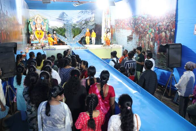 ಕಂಚಗಾರ ಓಣಿಯ ಹಿರೇಪೇಟೆ, ಭೂಸಪೇಟೆ ಶ್ರೀ ಗಣೇಶೋತ್ಸವ ಮಂಡಳಿ ವತಿಯಿಂದ ಗಣೇಶೋತ್ಸವ ಪ್ರಯುಕ್ತ ಪ್ರಯಾಗರಾಜ್ ಕುಂಭಮೇಳ ಮಾದರಿ ಸನ್ನಿವೇಶ ವೀಕ್ಷಿಸುತ್ತಿರುವ ಭಕ್ತರು.1ಎಚ್ಯುಬಿ24