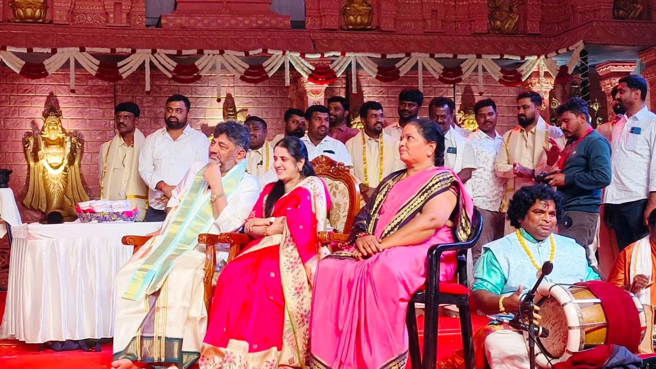 ಮಾಗಡಿ ಪಟ್ಟಣದ ಕೋಟೆ ಮೈದಾನದಲ್ಲಿ ಆಯೋಜಿಸಿದ್ದ ಶ್ರೀನಿವಾಸ ಕಲ್ಯಾಣೋತ್ಸವದಲ್ಲಿ ಉಪಮುಖ್ಯಮಂತ್ರಿ ಡಿ.ಕೆ.ಶಿವಕುಮಾರ್ ದಂಪತಿ ಪಾಲ್ಗೊಂಡಿರುವುದು.