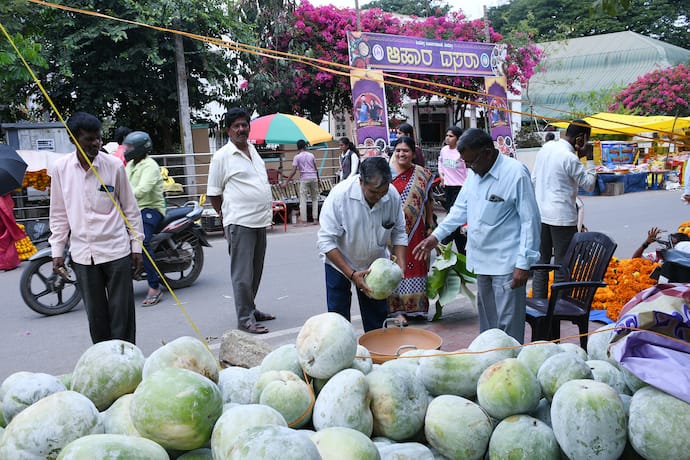 ಶಿವಮೊಗ್ಗ: ನಗರದೆಲ್ಲೆಡೆ ಆಯುಧ ಪೂಜೆ ಮತ್ತು ವಿಜಯದಶಮಿ ಹಬ್ಬದ ಸಂಭ್ರಮ-ಸಡಗರ ಮನೆ ಮಾಡಿದ್ದು, ಆಯುಧ ಪೂಜೆ ಹಿನ್ನೆಲೆ ಮಂಗಳವಾರ ಅಗತ್ಯವಾದ ಹೂವು-ಹಣ್ಣು, ಬೂದ ಗುಂಬಳ ಖರೀದಿ ಜೋರಾಗಿತ್ತು.