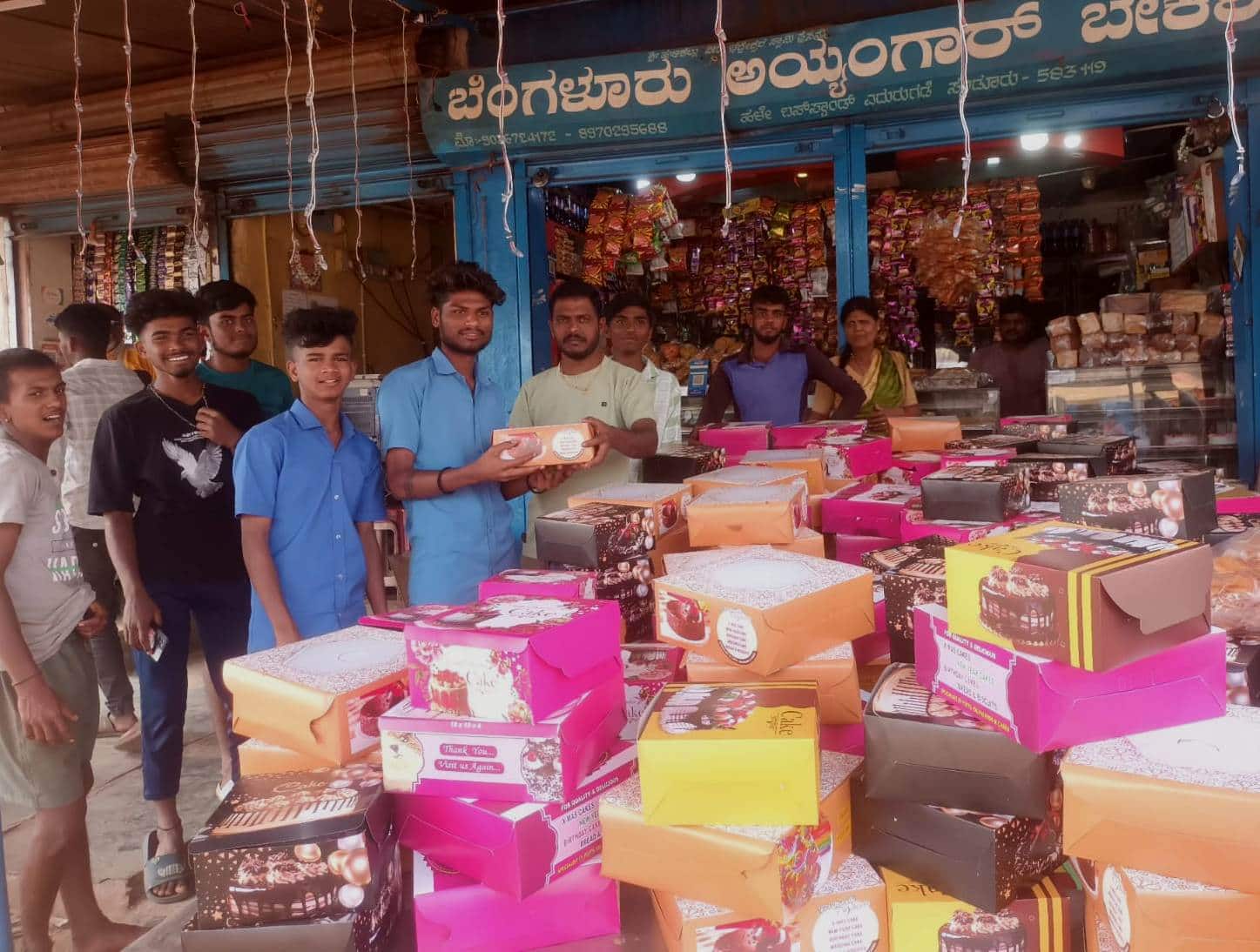 ಸಂಡೂರಿನ ಬೇಕರಿಯ ಮುಂದೆ ಹೊಸ ವರ್ಷಕ್ಕಾಗಿ ಸಿದ್ಧಪಡಿಸಿರುವ ಕೇಕ್ಗಳನ್ನು ಯುವಕರು ಖರೀದಿಸುತ್ತಿರುವುದು.