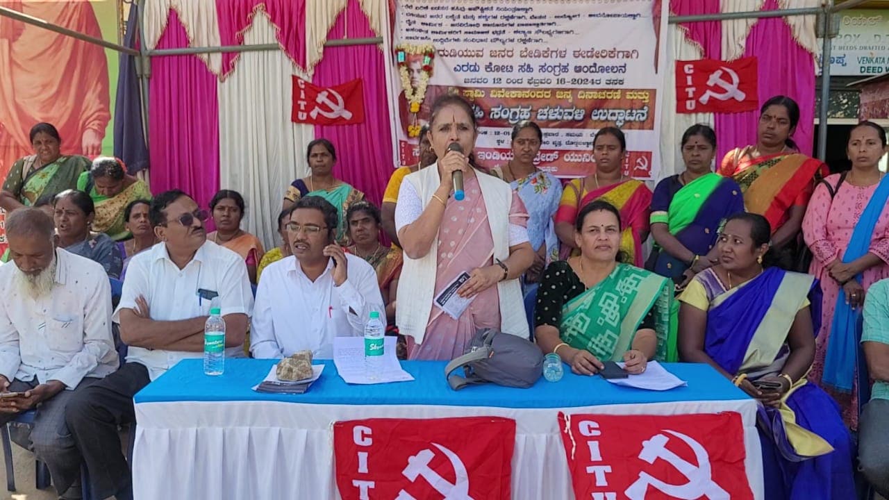 ನಗರದ ತಾಲೂಕು ಕಚೇರಿ ವೃತ್ತದಲ್ಲಿ ಸಿಐಟಿಯು ತಾಲೂಕು ಸಮಿತಿಯಿಂದ ಸ್ವಾಮಿ ವಿವೇಕಾನಂದ ಜಯಂತಿ ಮತ್ತು ಎರಡು ಕೋಟಿ ಸಹಿ ಸಂಗ್ರಹ ಆಂದೋಲನಕ್ಕೆ ಚಾಲನೆ ನೀಡಿ ಮಾತನಾಡಿ, ಕನಿಷ್ಠ ವೇತನವನ್ನು ಕುಶಲ ಕಾರ್ಮಿಕರಿಗೆ ₹31,000 ಹಾಗೂ ಹೆಚ್ಚಿನ ಕೌಶಲ್ಯದ ಪ್ರತಿ ಹಂತಕ್ಕೆ ಶೇ.15 ಹೆಚ್ಚಳದೊಂದಿಗೆ ನಿಗದಿಪಡಿಸಬೇಕು.