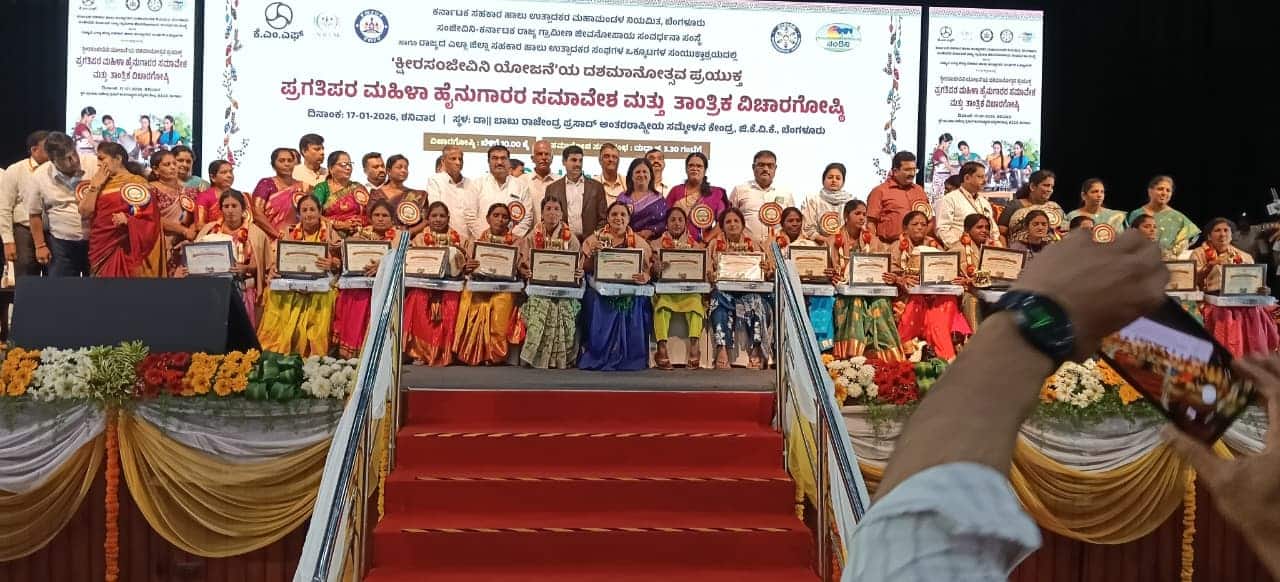 ಬೆಂಗಳೂರಿನ ಜಿಕೆವಿಕೆ ಸಭಾಂಗಣದಲ್ಲಿ ನಡೆದ ಕ್ಷೀರ ಸಂಜೀವಿನಿ ಯೋಜನೆಯ ದಶಮಾನೋತ್ಸವ ಪ್ರಯುಕ್ತ, ಕರ್ನಾಟಕ ಸಹಕಾರ ಹಾಲು ಉತ್ಪಾದಕರ ಮಹಾಮಂಡಳ ಮತ್ತು ಸಂಜೀವಿನಿ ಕರ್ನಾಟಕ ರಾಜ್ಯ ಗ್ರಾಮೀಣ ಜೀವನೋಪಾಯ ಸಂವರ್ಧನ ಸಂಸ್ಥೆ ಹಾಗೂ ಜಿಲ್ಲಾ ಸಹಕಾರ ಹಾಲು ಉತ್ಪಾದಕರ ಸಂಘಗಳ ಒಕ್ಕೂಟ ಸಂಯುಕ್ತಾಶ್ರಯದಲ್ಲಿ ನಡೆದ, ಪ್ರಗತಿಪರ ಮಹಿಳಾ ಹೈನುಗಾರರ ಸಮಾವೇಶ ಮತ್ತು ತಾಂತ್ರಿಕ ವಿಚಾರಗೋಷ್ಠಿ ಕಾರ್ಯಕ್ರಮದಲ್ಲಿ ಉಪ ಮುಖ್ಯಮಂತ್ರಿ ಡಿಕೆ ಶಿವಕುಮಾರ್, ಪ್ರಶಸ್ತಿ ಮತ್ತು ನಗದು ಬಹುಮಾನ ನೀಡಿ ಅಭಿನಂದಿಸಿದ್ದಾರೆ.
