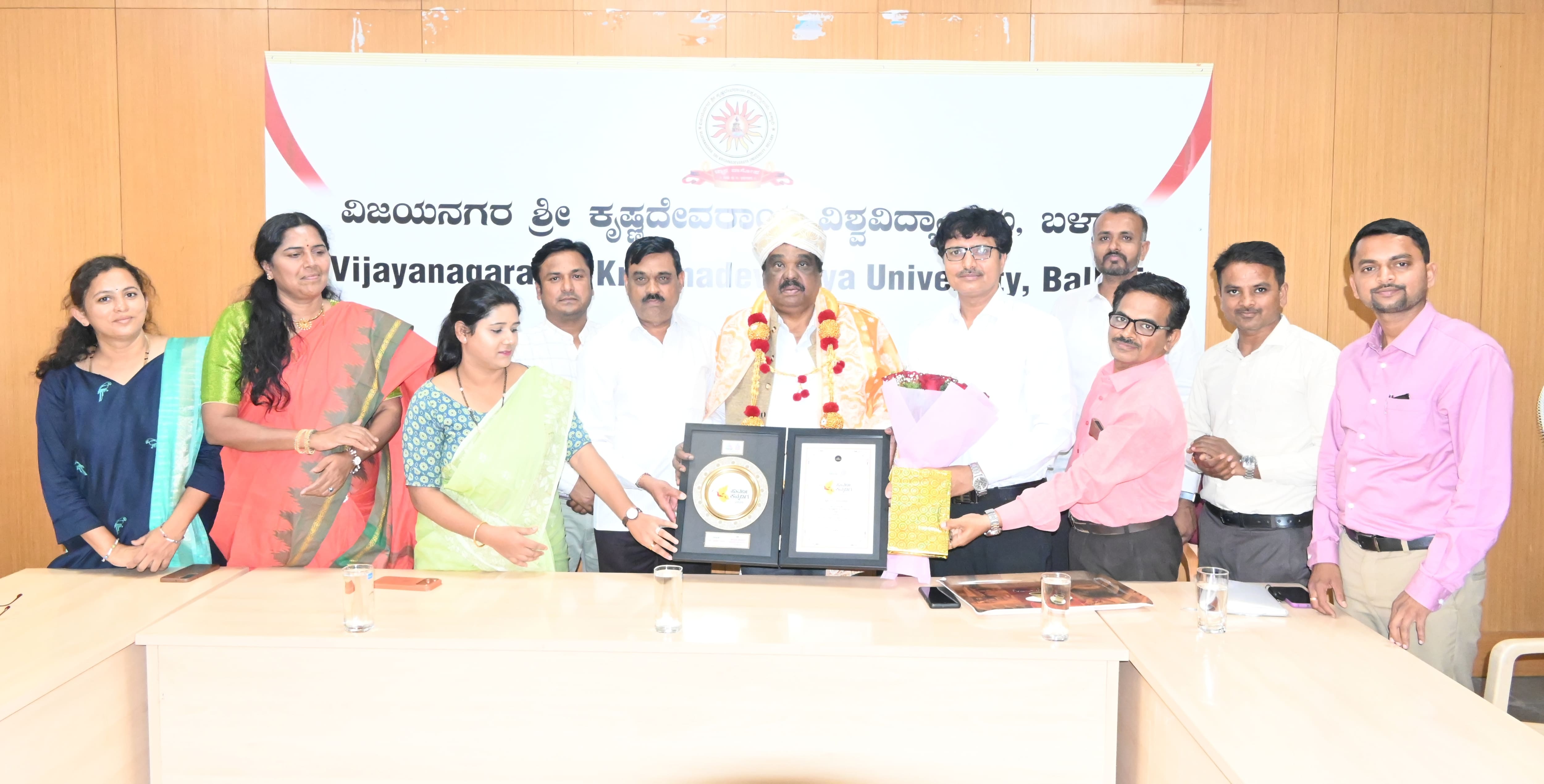 ಬಳ್ಳಾರಿ: ನಾಡಿನ ಪ್ರತಿಷ್ಠಿತ ಕನ್ನಡಪ್ರಭ ಮತ್ತು ಏಷ್ಯಾನೆಟ್ ಸುವರ್ಣ ನ್ಯೂಸ್ ಸಂಸ್ಥೆ ಕೊಡಮಾಡುವ ‘ಸುವರ್ಣ ಕನ್ನಡಿಗ-2026’ರ ಪ್ರಶಸ್ತಿಗೆ ಆಯ್ಕೆಗೊಂಡು ಈಚೆಗೆ ಬೆಂಗಳೂರಿನಲ್ಲಿ ಜರುಗಿದ ಕಾರ್ಯಕ್ರಮದಲ್ಲಿ ಪ್ರಶಸ್ತಿ ಸ್ವೀಕರಿಸಿದ ವಿಜಯನಗರ ಶ್ರೀಕೃಷ್ಣದೇವರಾಯ ವಿಶ್ವವಿದ್ಯಾಲಯದ ಕುಲಪತಿ ಪ್ರೊ. ಎಂ. ಮುನಿರಾಜು ಅವರನ್ನು ವಿವಿ ಸಭಾಂಗಣದಲ್ಲಿ ಸನ್ಮಾನಿಸಲಾಯಿತು.