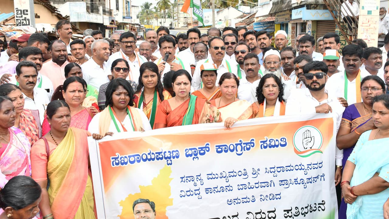 19 ಕೆಸಿಕೆಎಂ 5ಸಿಎಂ ಸಿದ್ದರಾಮಯ್ಯ ವಿರುದ್ಧ ಪ್ರಾಸಿಕ್ಯೂಷನ್ಗೆ ರಾಜ್ಯಪಾಲರು ಅನುಮತಿ ನೀಡಿರುವುದನ್ನು ಖಂಡಿಸಿ ಸಖರಾಯಪಟ್ಟಣದಲ್ಲಿ ಸೋಮವಾರ ಕಾಂಗ್ರೆಸ್ ಕಾರ್ಯಕರ್ತರು ಪ್ರತಿಭಟನಾ ಮೆರವಣಿಗೆ ನಡೆಸಿದರು.