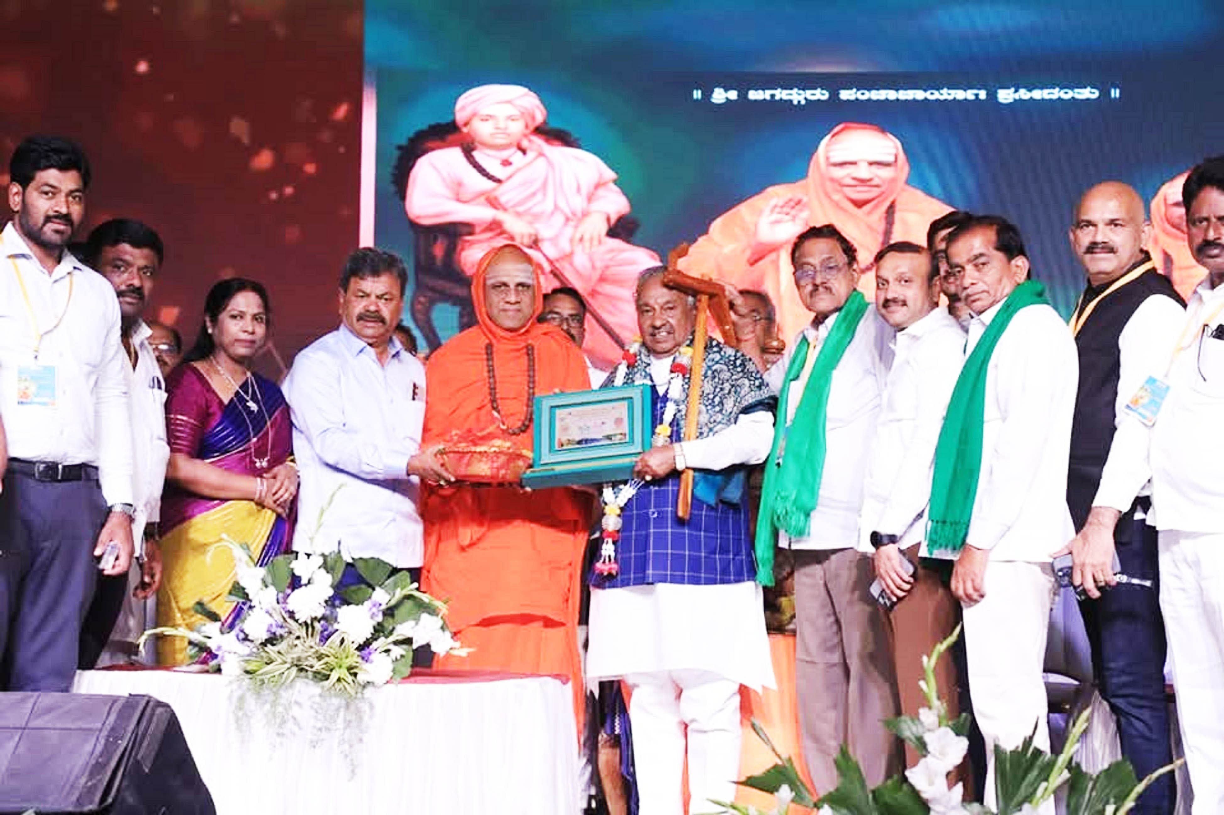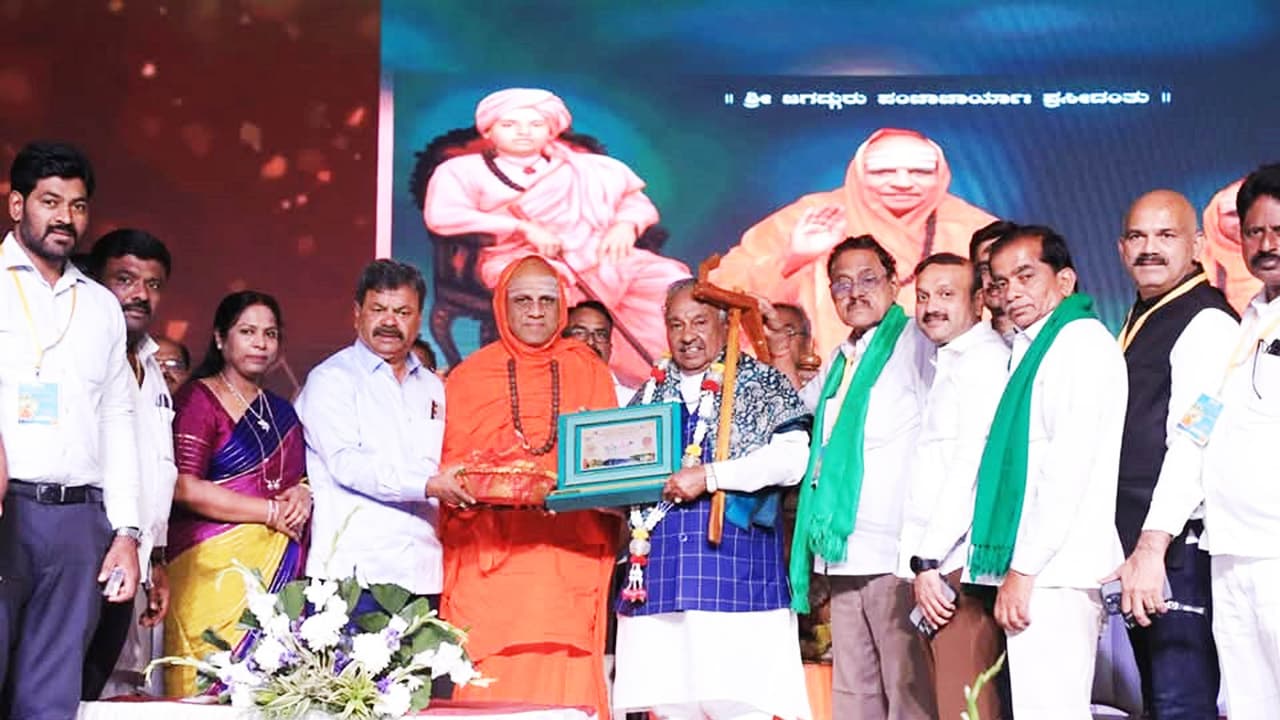 ಹೊನ್ನಾಳಿ ಹಿರೇಕಲ್ಮಠದಲ್ಲಿ ನಡೆದ ರಾಜ್ಯಮಟ್ಟದ ಕೃಷಿ ಮೇಳದಲ್ಲಿ ಮಾಜಿ ಡಿಸಿಎಂ ಕೆ.ಎಸ್.ಈಶ್ಸರಪ್ಪ ಅವರಿಗೆ ಹಿರೇಕಲ್ಮಠದ ಸ್ವಾಮೀಜಿ ಅವರು ಮರದ ನೇಗಿಲು ನೀಡಿ ಸನ್ನಾನಿಸಿದರು.