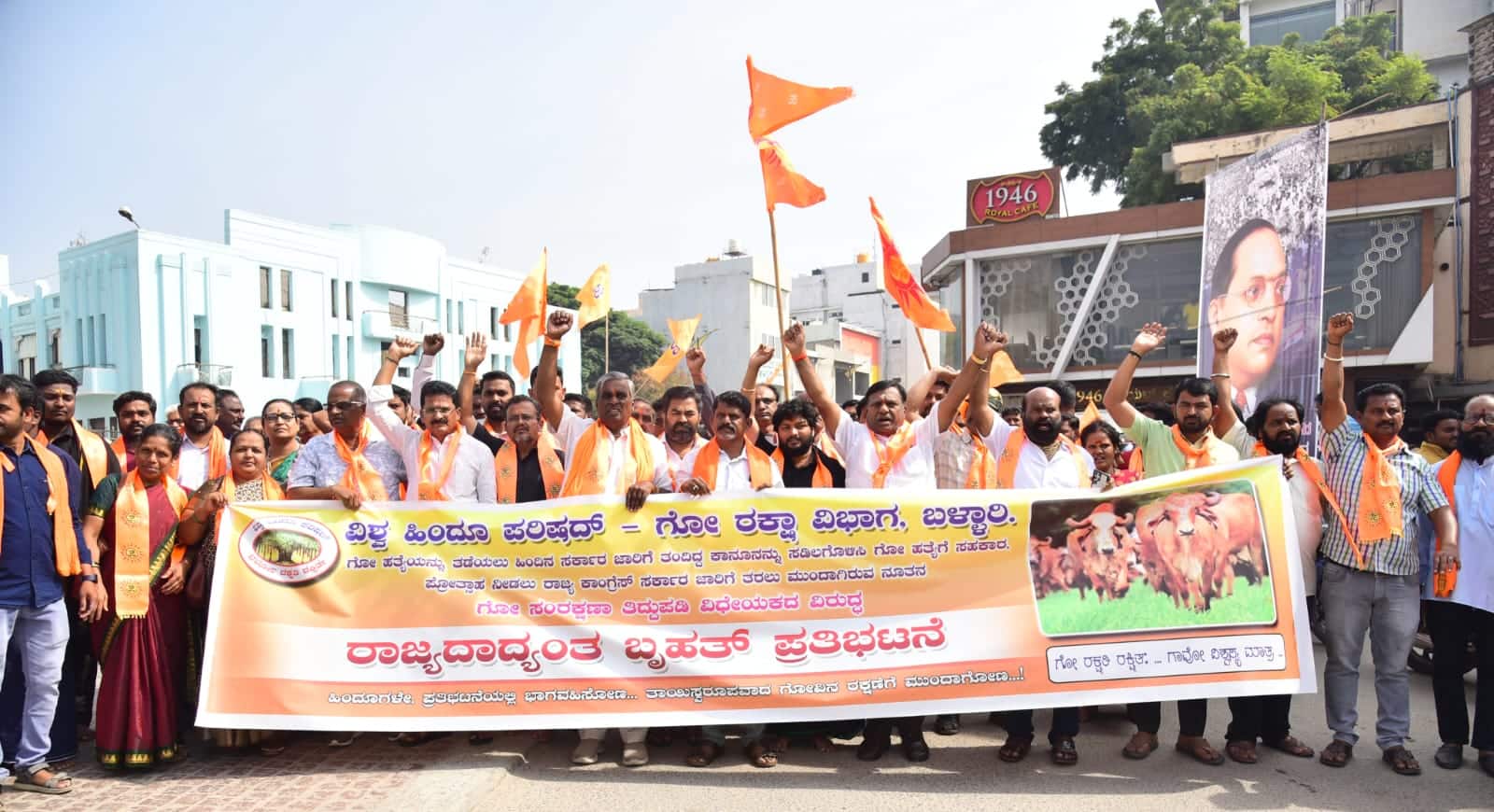 ಕರ್ನಾಟಕ ಜಾನುವಾರು ಹತ್ಯೆ ಪ್ರತಿಬಂಧಕ ಹಾಗೂ ಸಂರಕ್ಷಣಾ ಕಾಯ್ದೆ 2020ಕ್ಕೆ ತಿದ್ದುಪಡಿ ತರಲು ಮುಂದಾಗಿರುವ ಸರ್ಕಾರದ ಧೋರಣೆಯನ್ನು ಖಂಡಿಸಿ ವಿಶ್ವಹಿಂದೂ ಪರಿಷತ್ (ವಿಎಚ್ಪಿ) ಹಾಗೂ ಬಿಜೆಪಿ ಕಾರ್ಯಕರ್ತರು ನಗರದಲ್ಲಿ ಪ್ರತಿಭಟನೆ ನಡೆಸಿದರು.