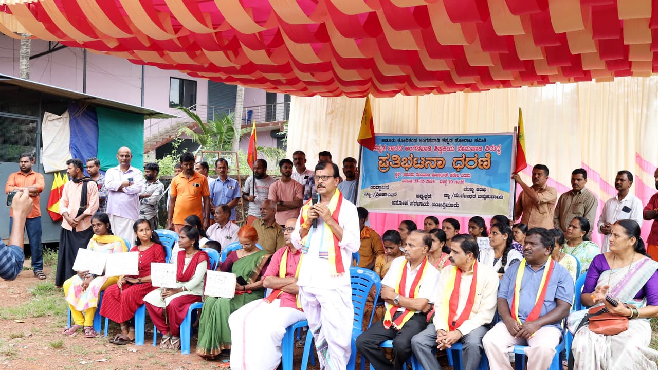 ಕಾಸರಗೋಡಿನ ಕೋರಿಕಂಡ ಕನ್ನಡ ಮಾಧ್ಯಮ ಅಂಗನವಾಡಿಗೆ ಮಲಯಾಳಿ ಭಾಷಿಕ ಶಿಕ್ಷಕಿಯ ನೇಮಕ ಹಿನ್ನೆಲೆಯಲ್ಲಿ ಸ್ಥಳೀಯ ದೇಲಂಪಾಡಿ ಗ್ರಾಮ ಪಂಚಾಯ್ತಿ ವಿರುದ್ಧ ಕನ್ನಡ ಹೋರಾಟ ಸಮಿತಿ ನೇತೃತ್ವದಲ್ಲಿ ಶುಕ್ರವಾರ ಪ್ರತಿಭಟನೆ ನಡೆಯಿತು.ಅಂಗನವಾಡಿ ಮಕ್ಕಳ ಹೆತ್ತವರು, ಪೋಷಕರು ಹಾಗೂ ಕನ್ನಡ ಸಂಘಟನೆಗಳು ಸೇರಿ ಪ್ರತಿಭಟನಾ ಮೆರವಣಿಗೆ ನಡೆಸಿ ಸಭೆ ನಡೆಸಿದರು. ಅಂಗನವಾಡಿ ಶಿಕ್ಷಕಿಯರ ನೇಮಕ ವಿಚಾರದಲ್ಲಿ ಪಂಚಾಯಿತಿ ಆಡಳಿತ ಕನ್ನಡ ಭಾಷಿಕರ ನಿರ್ಲಕ್ಷ್ಯ ವಹಿಸಿದೆ. ಪಂಚಾಯ್ತಿ ಸಮಿತಿಯ ಪಟ್ಟಿಯಲ್ಲಿ ಕನ್ನಡೇತರರಿಗೆ ಪ್ರಾಶಸ್ತ್ಯ ನೀಡಲಾಗಿದೆ. ಇದು ಸರಿಯಾದ ಕ್ರಮವಲ್ಲ ಎಂದು ಪ್ರತಿಭಟನಾ ನಿರತರು ಆರೋಪಿಸಿದರು.