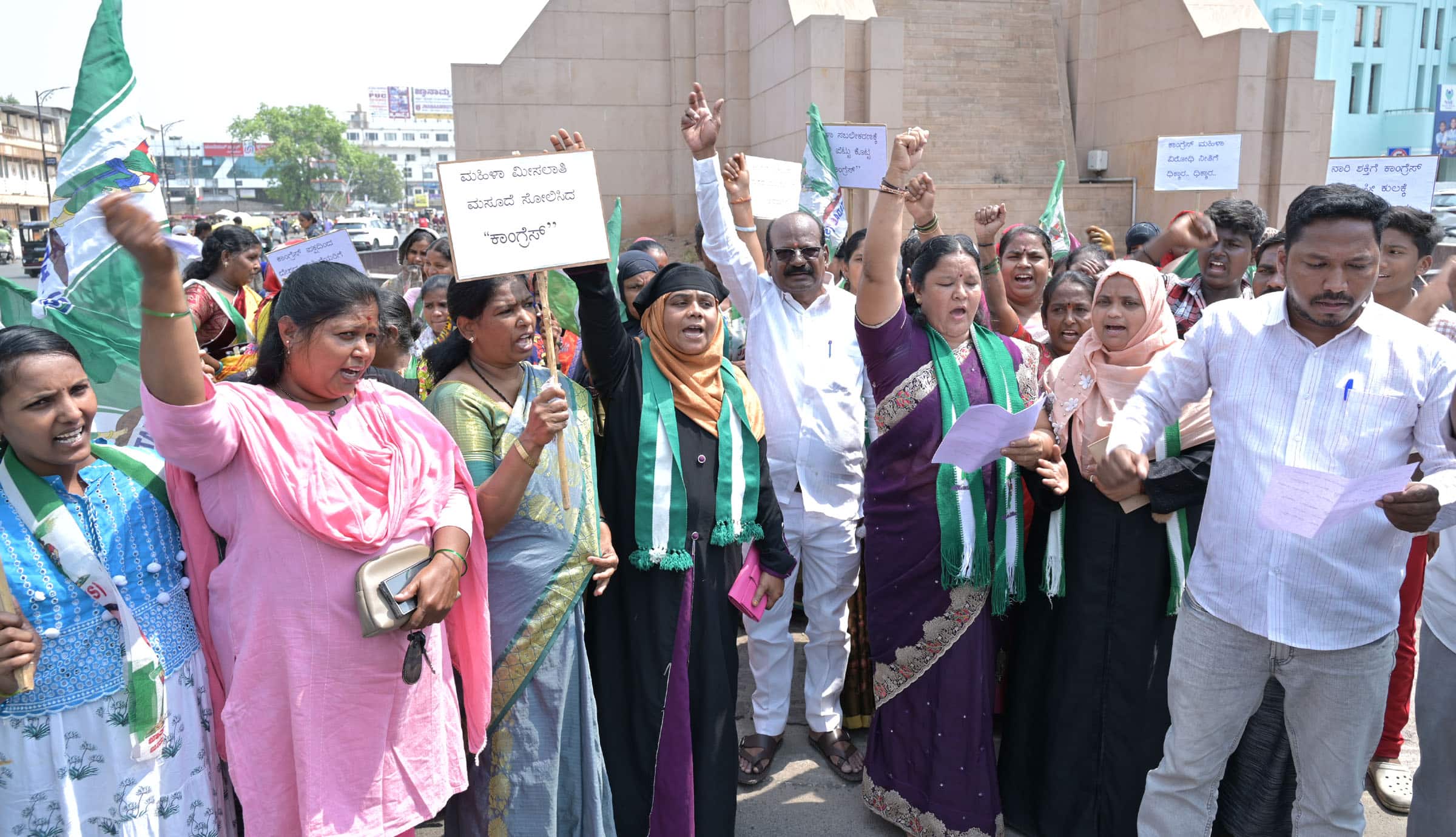 ಇಲ್ಲಿನ ಜೆಡಿಎಸ್ ಜಿಲ್ಲಾ ಕಚೇರಿಯಿಂದ ಗಡಗಿಚನ್ನಪ್ಪ ವೃತ್ತಕ್ಕೆ ಮೆರವಣಿಗೆಯಲ್ಲಿ ಆಗಮಿಸಿದ ಪಕ್ಷದ ನೂರಾರು ಮಹಿಳೆಯರು ಪ್ರತಿಭಟನಾ ಧರಣಿ ನಡೆಸಿ, ಕಾಂಗ್ರೆಸ್ ನೀತಿಯ ವಿರುದ್ಧ ಘೋಷಣೆಗಳನ್ನು ಕೂಗಿದರು.ಮಹಿಳಾ ವಿರೋಧಿ ಧೋರಣೆ ಹೊಂದಿರುವ ಕಾಂಗ್ರೆಸ್ ಇದೀಗ ಎನ್ಡಿಎ ಸರ್ಕಾರದಲ್ಲಿ ಪ್ರಧಾನಿ ನರೇಂದ್ರ ಮೋದಿ ಮಸೂದೆಯನ್ನು ಲೋಕಸಭೆಯಲ್ಲಿ ಮಂಡಿಸಿದಾಗ ವಿರೋಧಿಸುವ ಮೂಲಕ ತನ್ನ ನೀಚ ಸಂಸ್ಕೃತಿ ಪ್ರದರ್ಶಿಸಿದೆ. ಪ್ರಜಾಪ್ರಭುತ್ವ ಹಾಗೂ ಮಹಿಳೆಯರಿಗೆ ಅವಮಾನ ಮಾಡಿದೆ.