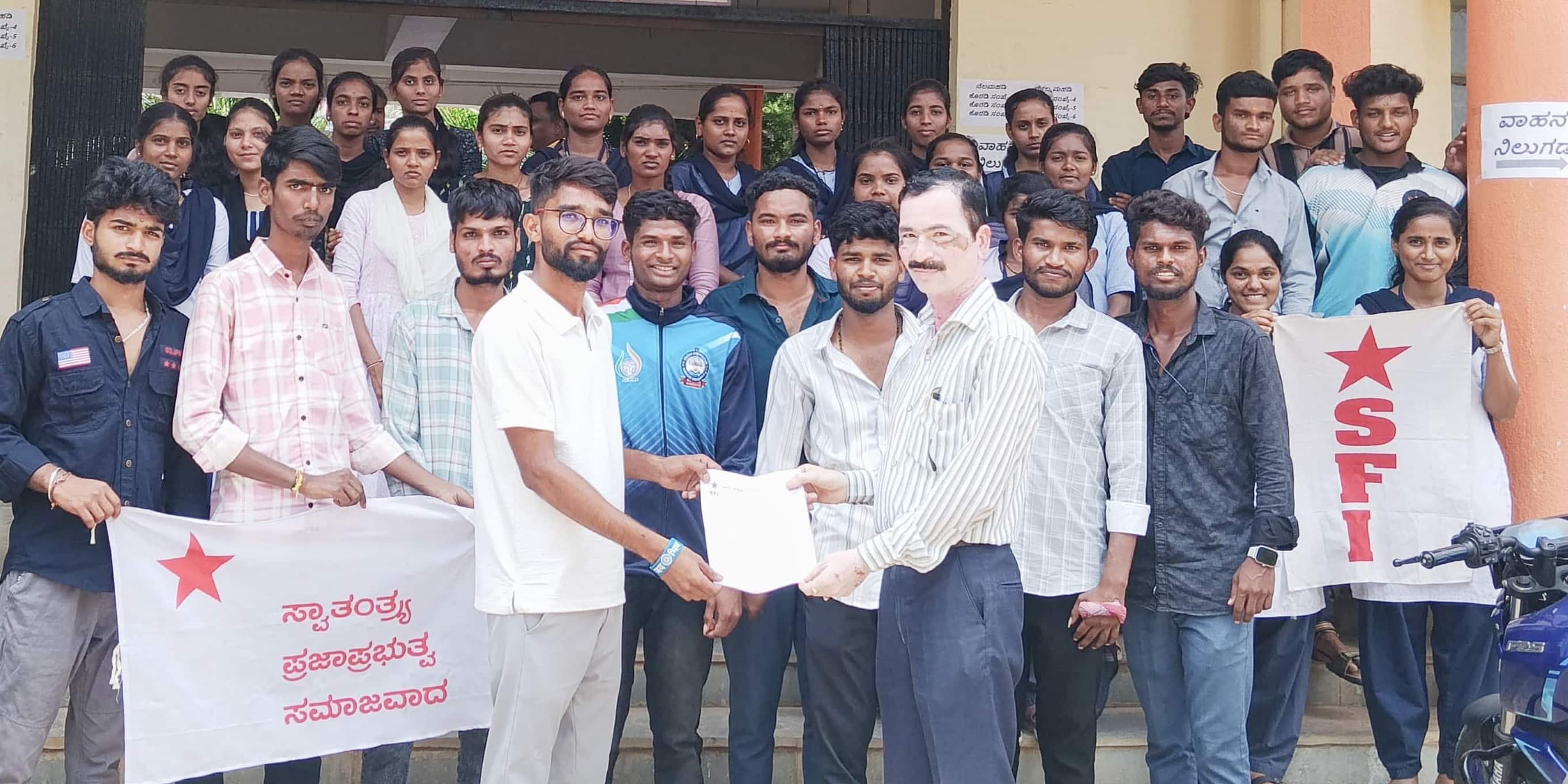 ಹಾವೇರಿ ವಿಶ್ವವಿದ್ಯಾಲಯದ ಮೊದಲ ಘಟಿಕೋತ್ಸವವನ್ನು ಖಾಸಗಿ ಕಾಲೇಜಿನಲ್ಲಿ ನಡೆಸಲು ಕೈಗೊಂಡಿರುವ ತೀರ್ಮಾನವನ್ನು ವಿರೋಧಿಸಿ, ಘಟಿಕೋತ್ಸವವನ್ನು ವಿಶ್ವವಿದ್ಯಾಲಯದ ಕ್ಯಾಂಪಸ್ನಲ್ಲಿಯೇ ನಡೆಸುವಂತೆ ಆಗ್ರಹಿಸಿ ಭಾರತ ವಿದ್ಯಾರ್ಥಿ ಫೆಡರೇಷನ್ (ಎಸ್ಎಫ್ಐ) ಸಂಘಟನೆಯ ನೇತೃತ್ವದಲ್ಲಿ ವಿದ್ಯಾರ್ಥಿಗಳು ಶುಕ್ರವಾರ ಸರ್ಕಾರಿ ಪ್ರಥಮ ದರ್ಜೆ ಮಹಾವಿದ್ಯಾಲಯದ ಎದುರು ಪ್ರತಿಭಟನೆ ನಡೆಸಿ ಮನವಿ ಸಲ್ಲಿಸಿ ಒತ್ತಾಯಿಸಿದರು.