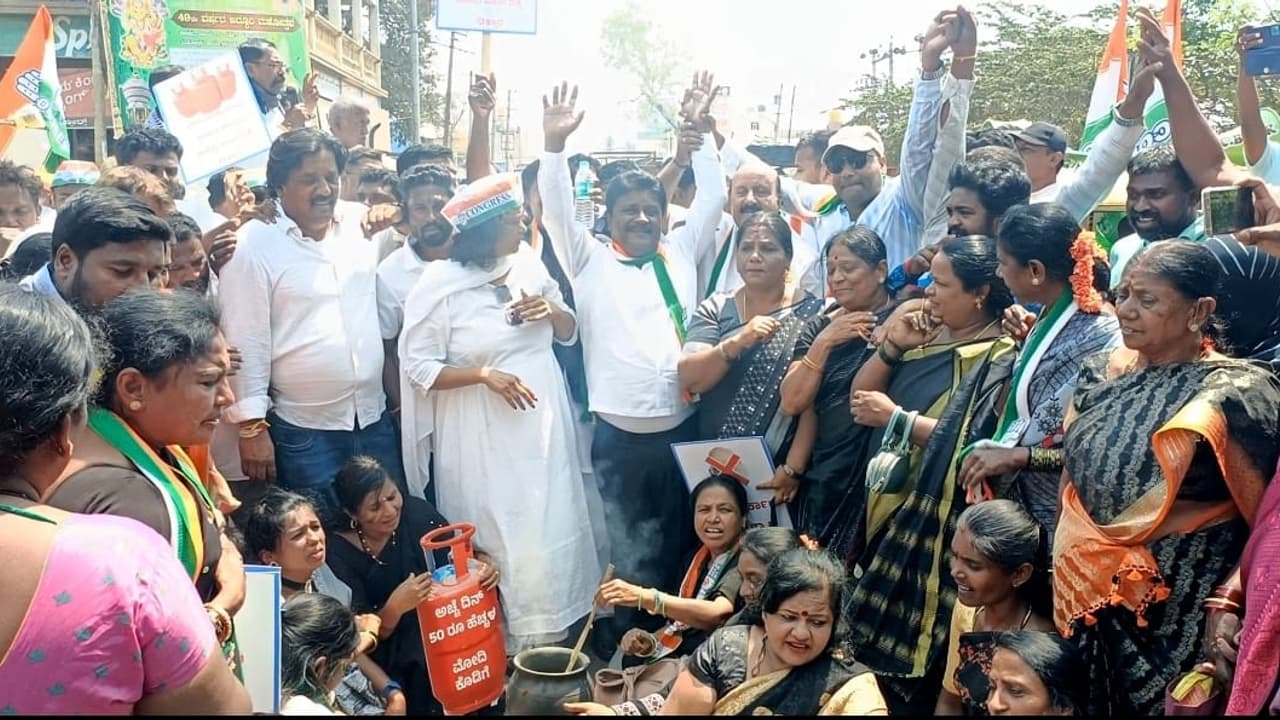 ಬಳಿಕ ಮಹಿಳಾ ಕಾಂಗ್ರೆಸ್ ಕಾರ್ಯಕರ್ತೆಯರು ತೀವ್ರ ಬಿಸಿಲಿನಲ್ಲೇ ರಸ್ತೆಯಲ್ಲೇ ಸೌದೆ ಒಲೆ ಇಟ್ಟು ಅಡುಗೆ ಮಾಡುವ ಮೂಲಕ ಕೇಂದ್ರ ಬಿಜೆಪಿ ಸರ್ಕಾರದ ವಿರುದ್ಧ ಘೋಷಣೆಗಳನ್ನು ಕೂಗಿದರು.ಈ ವೇಳೆ ರಾಜ್ಯ ಬೀಜ ನಿಗಮ ಮಂಡಳಿ ಅಧ್ಯಕ್ಷ ಎಂ.ಆಂಜಿನಪ್ಪ ಮಾತನಾಡಿ, ಯಾವುದೇ ದೇಶಗಳ ನಡುವೆ ನಡೆಯುವ ಯುದ್ಧ ಇತರ ದೇಶಗಳ ಮೇಲೂ ಪರಿಣಾಮ ಬೀರುತ್ತದೆ. ಎಲ್ಲ ಸಮಸ್ಯೆಗಳಿಗೂ ಯುದ್ಧವೇ ಪರಿಹಾರವಲ್ಲ. ಮಹಾತ್ಮ ಗಾಂಧೀಜಿ ಅವರು ತಿಳಿಸಿದ ಶಾಂತಿಯ ಮಾರ್ಗವನ್ನು ಅನುಸರಿಸಿದಾಗ ಮಾತ್ರ ವಿಶ್ವದಲ್ಲಿ ಶಾಂತಿ ನೆಲೆಸಲು ಸಾಧ್ಯ. ಗಾಂಧೀಜಿ ಅವರ ತತ್ವಗಳನ್ನು ನಾವು ವಿಶ್ವಕ್ಕೆ ತಿಳಿಸಬೇಕಾಗಿದೆ. ಅಡುಗೆ ಅನಿಲ ಸಿಲಿಂಡರ್ ಬೆಲೆ ಏರಿಕೆ ಮಾಡಿ ಕೇಂದ್ರ ಸರ್ಕಾರ ಬಡವರ ಹೊಟ್ಟೆಯ ಮೇಲೆ ಬರೆ ಎಳೆಯುವ ಕೆಲಸ ಮಾಡುತ್ತಿದೆ.