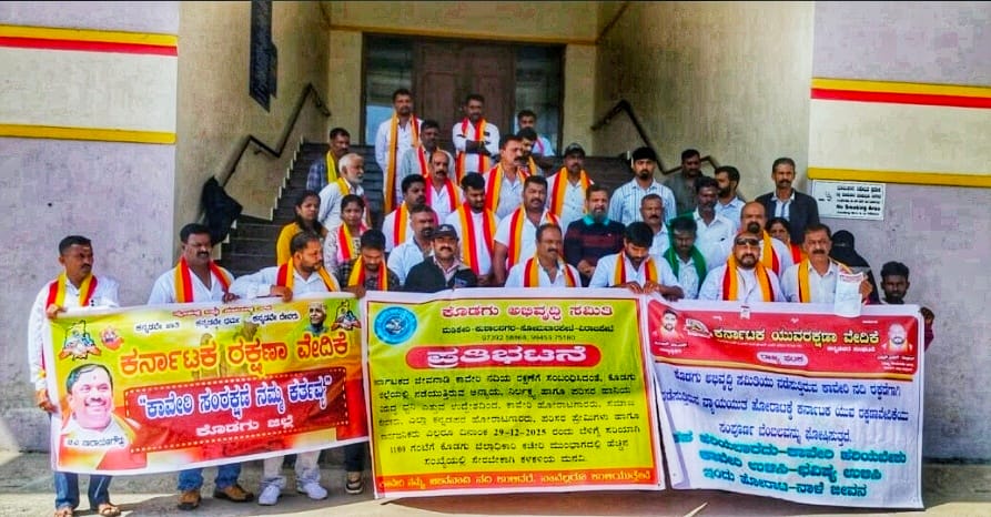 ಕರ್ನಾಟಕ ಯುವ ರಕ್ಷಣಾ ವೇದಿಕೆ ರಾಜ್ಯ ಕಾರ್ಯದರ್ಶಿ ಹಾಗೂ ಕೊಡಗು ಜಿಲ್ಲಾ ಉಸ್ತುವಾರಿ ಎಂ.ಎಂ. ದಾವೂದ್ ಮಾತನಾಡಿ, ಕಾವೇರಿ ನದಿ ಕೊಡಗು ಜಿಲ್ಲೆಯ ಜೀವನಾಡಿಯಾಗಿದ್ದು, ಇಡೀ ರಾಜ್ಯದ ಕೋಟ್ಯಂತರ ಜನರ ಕುಡಿಯುವ ನೀರಿನ ಮೂಲವಾಗಿದೆ. ನದಿಗೆ ಕಸ ತ್ಯಾಜ್ಯ ಎಸೆಯುವವರ ವಿರುದ್ಧ ಕ್ರಮ ಕೈಗೊಳ್ಳಬೇಕು ಎಂದು ಆಗ್ರಹಿಸಿದರು.ಈ ಸಂದರ್ಭ ವಿವಿಧ ಬೇಡಿಕೆ ಈಡೇರಿಕೆ ಆಗ್ರಹಿಸಿ ಜಿಲ್ಲಾಡಳಿತಕ್ಕೆ ಪ್ರತಿಭಟನಾಕಾರರು ಮನವಿ ಸಲ್ಲಿಸಿದರು. ಪ್ರತಿಭಟನೆಯಲ್ಲಿ ಕರ್ನಾಟಕ ರಕ್ಷಣಾ ವೇದಿಕೆ ಅಧ್ಯಕ್ಷ ಅಣ್ಣಯ್ಯ, ಕೊಡಗು ಅಭಿವೃದ್ಧಿ ಸಮಿತಿ ಪ್ರಧಾನ ಕಾರ್ಯದರ್ಶಿ ಲವ, ಕಾರ್ಯದರ್ಶಿ ಪ್ರಮೋದ್ ಹಾಗೂ ರೈತ ಮುಖಂಡರು, ಕರ್ನಾಟಕ ರಕ್ಷಣಾ ವೇದಿಕೆ, ಕರ್ನಾಟಕ ಯುವ ರಕ್ಷಣಾ ವೇದಿಕೆಯ ಪದಾಧಿಕಾರಿಗಳು ಪಾಲ್ಗೊಂಡಿದ್ದರು.