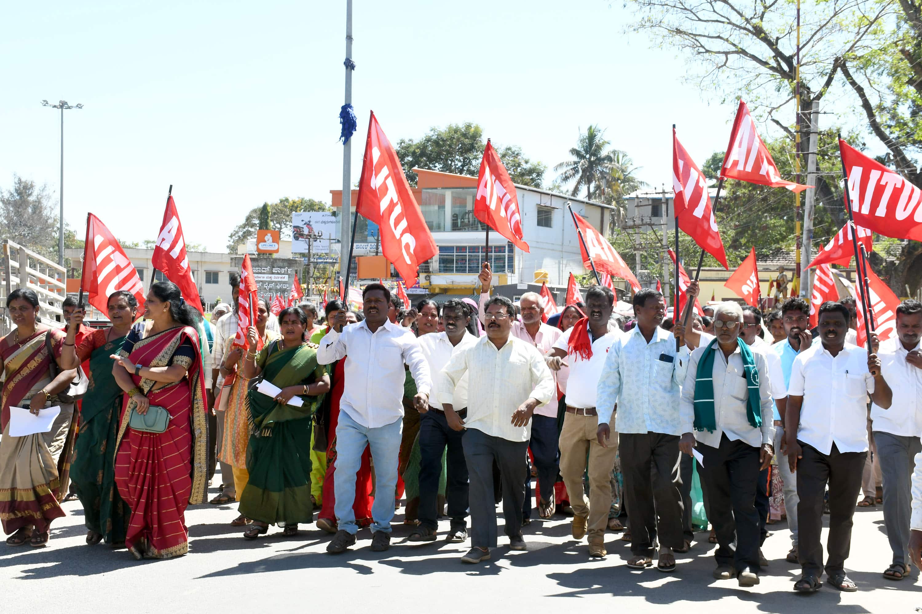 ಆಜಾದ್ಪಾರ್ಕ್ ವೃತ್ತದವರೆಗೂ ಎಐಟಿಯುಸಿ, ಪ್ಲಾಂಟೇಷನ್ ಯೂನಿಯನ್, ಬಿಸಿಯೂಟ-ಅಂಗನವಾಡಿ ಕಾರ್ಯಕರ್ತೆಯರ ಮೆರವಣಿಗೆ