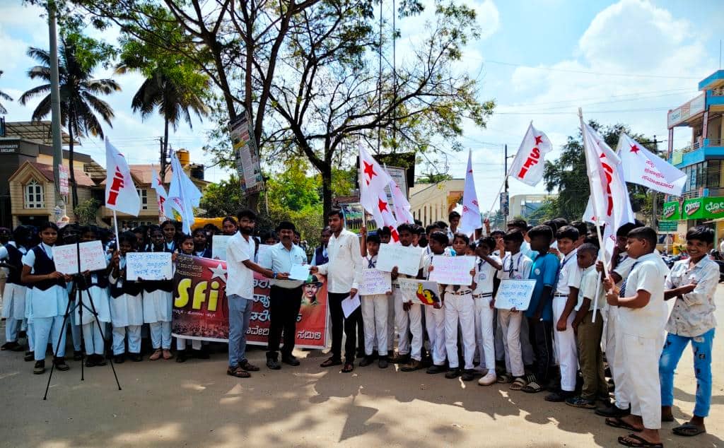 ಹಾವೇರಿ: ರಾಜ್ಯದ 700 ಪಂಚಾಯಿತಿಗಳ ಮಟ್ಟದಲ್ಲಿ ಕರ್ನಾಟಕ ಪಬ್ಲಿಕ್ ಶಾಲೆಗಳಾಗಿ ಉನ್ನತೀಕರಿಸಿ ಸುತ್ತಮುತ್ತಲಿನ ಸರ್ಕಾರಿ ಶಾಲೆ, ಪದವಿ ಪೂರ್ವ ಕಾಲೇಜುಗಳನ್ನು ವಿಲೀನಗೊಳಿಸಲು ಮುಂದಾಗಿರುವ ರಾಜ್ಯ ಸರ್ಕಾರದ ಕ್ರಮವನ್ನು ಖಂಡಿಸಿ, ಸರ್ಕಾರಿ ಶಾಲೆಗಳ ಉಳಿವಿಗಾಗಿ ಒತ್ತಾಯಿಸಿ ಭಾರತ ವಿದ್ಯಾರ್ಥಿ ಫೆಡರೇಷನ್ ಜಿಲ್ಲಾ ಸಮಿತಿ ನೇತೃತ್ವದಲ್ಲಿ ವಿದ್ಯಾರ್ಥಿಗಳು ಬುಧವಾರ ನಗರದ ಜೆ.ಎಚ್. ಪಟೇಲ್ ವೃತ್ತದಲ್ಲಿ ಬೃಹತ್ ಮಾನವ ಸರಪಳಿ ನಿರ್ಮಿಸಿ ಪ್ರತಿಭಟನೆ ನಡೆಸಿದರು. ನಗರದ ಮುನ್ಸಿಪಲ್ ಮೈದಾನದಿಂದ ವಿದ್ಯಾರ್ಥಿಗಳು ಮೆರವಣಿಗೆ ಆರಂಭಿಸಿ ಜೆ.ಎಚ್. ಪಟೇಲ್ ವೃತ್ತದಲ್ಲಿ ಸಮಾವೇಶಗೊಂಡರು. ನಂತರ ರಾಜ್ಯ ಸರ್ಕಾರದ ವಿರುದ್ಧ ಘೋಷಣೆ ಕೂಗಿ ಆಕ್ರೋಶ ವ್ಯಕ್ತಪಡಿಸಿದರು. ಈ ಸಂದರ್ಭದಲ್ಲಿ ಎಸ್ಎಫ್ಐ ಜಿಲ್ಲಾಧ್ಯಕ್ಷ ಬಸವರಾಜ ಎಸ್. ಮಾತನಾಡಿ, ಖಾಸಗಿ ಶಾಲಾ ಕಾಲೇಜುಗಳಿಗೆ ಕಡಿವಾಣ ಹಾಕುವ ಬದಲಾಗಿ ಸರ್ಕಾರಿ ಶಾಲೆಗಳನ್ನು ವಿಲೀನದ ಹೆಸರಿನಲ್ಲಿ ಬಂದ್ ಮಾಡಲು ಮುಂದಾಗುತ್ತಿರುವುದು ನಾಚಿಕೆಗೇಡಿನ ಸಂಗತಿ. ರಾಜ್ಯ ಸರ್ಕಾರಕ್ಕೆ ತಾಕತ್ತು ಇದ್ದರೆ ಸರ್ಕಾರಿ ಶಾಲೆಯ ಹತ್ತು ಕಿಲೋಮೀಟರ್ ವ್ಯಾಪ್ತಿಯಲ್ಲಿರುವ ಖಾಸಗಿ ಶಾಲಾ ಕಾಲೇಜುಗಳನ್ನು ಬಂದ್ ಮಾಡಲಿ ಎಂದು ಆಗ್ರಹಿಸಿದರು.ಈ ಕೆಪಿಎಸ್ ಶಾಲೆಯಿಂದ ವಿಲೀನವಾಗುತ್ತಿರುವ ಶಾಲೆಗಳು ಸುಮಾರು 2ರಿಂದ 6 ಕಿಮೀ ದೂರದಲ್ಲಿದೆ. ರಾಜ್ಯದಲ್ಲಿ ವರ್ಷದಿಂದ ವರ್ಷಕ್ಕೆ ಸರ್ಕಾರಿ ಶಾಲೆಗಳಲ್ಲಿ ದಾಖಲಾತಿ ಪ್ರಮಾಣ ಕಡಿಮೆಯಾಗುತ್ತಿದೆ ಎಂದು ಸರ್ಕಾರ ಒಪ್ಪಿಕೊಂಡಿದೆ. ದಾಖಲಾತಿ ನೆಪಹೇಳಿ ಸರ್ಕಾರಿ ಶಾಲೆಗಳನ್ನು ಮುಚ್ಚುತ್ತಿದೆ. ಸರ್ಕಾರಿ ಶಾಲೆಯಲ್ಲಿ ದಾಖಲಾತಿ ಯಾಕೆ ಕಡಿಮೆಯಾಗುತ್ತಿದೆ ಎಂದು ಅಧ್ಯಯನ ಮಾಡದೇ ಸರ್ಕಾರಿ ಶಾಲೆಗಳಿಗೆ ಮೂಲಭೂತ ಸೌಕರ್ಯ, ಶಿಕ್ಷಕರ ನೇಮಕಾತಿ, ಸರಿಯಾದ ಸಮಯಕ್ಕೆ ಪಠ್ಯ ಪುಸ್ತಕ ನೀಡದೆ ಹಾಗೂ ಸೈಕಲ್ ಯೋಜನೆ ನಿಲ್ಲಿಸಿರುವುದು ಹೀಗೆ ಯಾವುದೇ ಸೌಲಭ್ಯ ನೀಡದೆ ಸರ್ಕಾರ ಖಾಸಗಿಯವರ ಲಾಬಿಗೆ ಇಂದು ಸಾರ್ವಜನಿಕ ಶಿಕ್ಷಣ ವ್ಯವಸ್ಥೆಯನ್ನು ನಾಶ ಮಾಡಲು ಸರ್ಕಾರ ಮುಂದಾಗಿರುವುದು ಖಂಡನೀಯ ಎಂದರು.ಎಸ್ಎಫ್ಐ ಜಿಲ್ಲಾ ಮುಖಂಡ ಅರುಣ್ ನಾಗವತ್ ಮಾತನಾಡಿ, ರಾಜ್ಯದಲ್ಲಿರುವ ಸರ್ಕಾರಿ ಶಾಲೆಗಳಿಗೆ ಮೂಲಭೂತ ಸೌಕರ್ಯ ಒದಗಿಸಬೇಕು ಹಾಗೂ ಖಾಲಿ ಇರುವ 59,000 ಶಿಕ್ಷಕರ ನೇಮಕಾತಿ ಮಾಡಿಕೊಳ್ಳಬೇಕು ಆಗ್ರಹಿಸಿ ಕ್ಷೇತ್ರ ಶಿಕ್ಷಣಾಧಿಕಾರಿ ಎಂ.ಎಚ್. ಪಾಟೀಲ್ ಮೂಲಕ ಮುಖ್ಯಮಂತ್ರಿ ಸಿದ್ಧಾರಾಮಯ್ಯ ಅವರಿಗೆ ಮನವಿ ಪತ್ರ ಸಲ್ಲಿಸಿದರು.ಈ ಸಂದರ್ಭದಲ್ಲಿ ಕಾವೇರಿ ಹರವಿಶೆಟ್ಟರ್, ತನುಜಾ ನೆಗಳೂರು, ಸುದೀಪ್ ಲಮಾಣಿ, ಕಿರಣ್ ಎಲ್, ತನುಜಾ ನೆಗಳೂರ, ಪ್ರದೀಪ್ ಲಮಾಣಿ, ಕಾವೇರಿ ಹರವಿಶೆಟ್ಟರ್, ಮಮತಾ ವಡ್ಡರ್, ಮೇಘ ಮೇಟಿ, ಸ್ವಪ್ನ ಕನವಳ್ಳಿ, ಭೀಮಮ್ಮ ವಡ್ಡರ್, ಸೋನಿಯಾ ನದಾಫ್, ವಂದನಾ ಬಾರ್ಕೆರ್, ಪ್ರಿಯಾಂಕ ಎಲ್, ಶ್ವೇತಾ ಎಲ್, ಕಾವೇರಿ ಪಾಟೀಲ್, ಪುಷ್ಪ ನಾಯಕ್ ಸೇರಿದಂತೆ ನೂರಾರು ವಿದ್ಯಾರ್ಥಿಗಳು ಪಾಲ್ಗೊಂಡಿದ್ದರು.