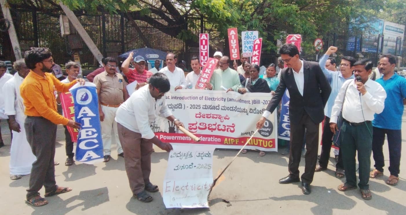 ಬಳ್ಳಾರಿ: ಕೇಂದ್ರ ಸರ್ಕಾರ ರೖತ-ಕಾರ್ಮಿಕರ ವಿರೋಧಿಯಾದ ವಿದ್ಯುಚ್ಛಕ್ತಿ ತಿದ್ದುಪಡಿ ಮಸೂದೆ 2025ಯನ್ನು ಸಂಸತ್ತಿನ ಅಧಿವೇಶನದಲ್ಲಿ ಮಂಡಿಸುತ್ತಿರುವುದನ್ನು ಖಂಡಿಸಿ ಎಐಪಿಎಫ್, ಎಐಕೆಕೆಎಂಎಸ್, ಎಐಯುಟಿಯುಸಿ ಹಾಗೂ ಅಖಿಲ ಭಾರತ ವಿದ್ಯುತ್ ಗ್ರಾಹಕರ ಸಂಘಗಳ ಮುಖಂಡರು ಜಂಟಿಯಾಗಿ ನಗರದಲ್ಲಿ ಮಂಗಳವಾರ ಪ್ರತಿಭಟನೆ ನಡೆಸಿದರು.