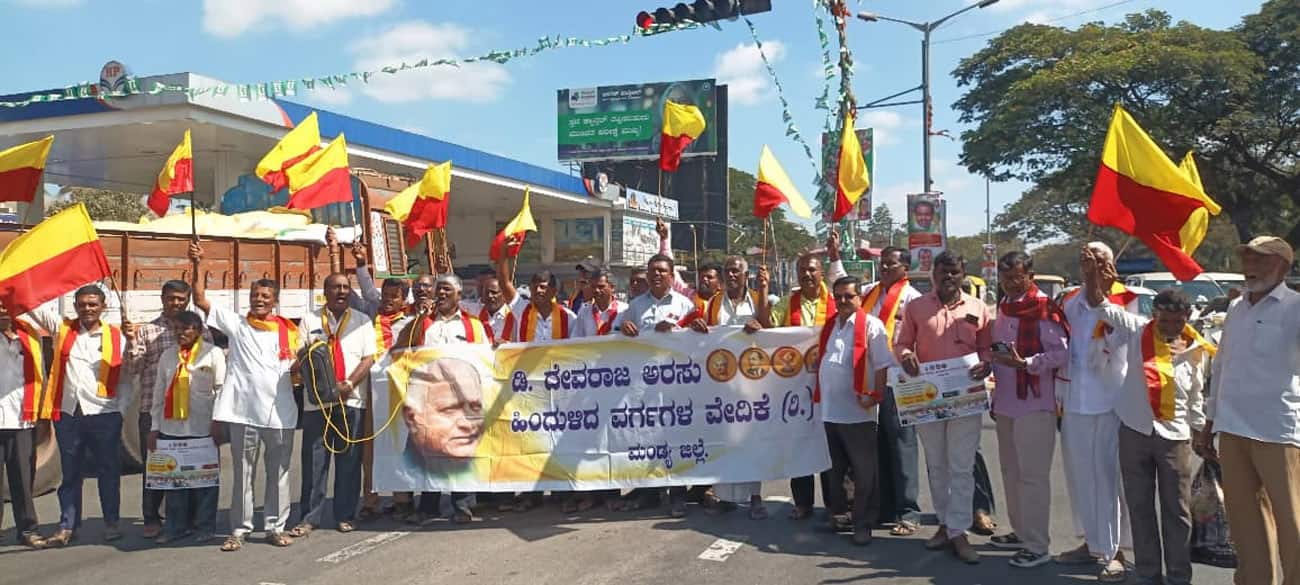 ಕೇಂದ್ರ ಸರ್ಕಾರದ ಆರ್ಥಿಕ ಧೋರಣೆ ಖಂಡಿಸಿ, ರಾಷ್ಟ್ರಕವಿ ಕುವೆಂಪು ಅವರಿಗೆ ಭಾರತ ರತ್ನ ನೀಡಬೇಕೆಂದು ಆಗ್ರಹಿಸಿ ಡಿ.ದೇವರಾಜ ಅರಸು ಹಿಂದುಳಿದ ವರ್ಗಗಳ ವೇದಿಕೆಯಿಂದ ಕರ್ನಾಟಕಕ್ಕೆ ನ್ಯಾಯ ಕೊಡಿ ಎಂದು ಒತ್ತಾಯಿಸಿ ಬುಧವಾರ ಪ್ರತಿಭಟನೆ ನಡೆಸಲಾಯಿತು.ನಗರದ ರೈತ ಸಭಾಂಗಣದ ಕುವೆಂಪು ಪ್ರತಿಮೆ ಬಳಿ ಸಮಾವೇಶಗೊಂಡ ಕಾರ್ಯಕರ್ತರು, ಕೇಂದ್ರ ಸರ್ಕಾರದ ಆರ್ಥಿಕ ಧೋರಣೆಯ ವಿರುದ್ಧ ಘೋಷಣೆ ಕೂಗಿದರು. ಬಳಿಕ ಜಯಚಾಮರಾಜೇಂದ್ರ ಒಡೆಯರ್ ವೃತ್ತಕ್ಕೆ ತೆರಳಿ ಕರ್ನಾಟಕ್ಕೆ ಆಗುತ್ತಿರುವ ಅನ್ಯಾಯದ ವಿರುದ್ಧ ಆಕ್ರೋಶ ವ್ಯಕ್ತಪಡಿಸಿದರು.