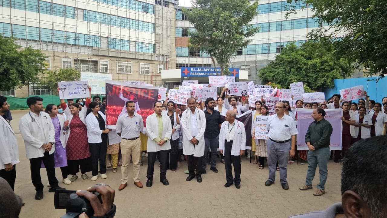 ಕೋಲ್ಕತ್ತದ ಆರ್.ಜಿ. ಕರ್ ವೈದ್ಯ ಕಾಲೇಜಿನಲ್ಲಿ ಕರ್ತವ್ಯ ನಿರತ ೩೨ ವರ್ಷದ ಸ್ನಾತಕೋತ್ತರ ತರಬೇತಿ ವೈದ್ಯೆ ಮೇಲೆ ಅತ್ಯಾಚಾರ ನಡೆಸಿ, ಕೊಲೆ ಮಾಡಿರುವುದನ್ನು ಖಂಡಿಸಿ ಭಾರತೀಯ ವೈದ್ಯಕೀಯ ಸಂಘ (ಐಎಂಎ)ಶನಿವಾರ ಕರೆ ನೀಡಿರುವ ರಾಷ್ಟ್ರವ್ಯಾಪಿ ಅನಿರ್ದಿಷ್ಟಾವಧಿ ಮುಷ್ಕರದಲ್ಲಿ ಭಾಗವಹಿಸಿ ಪ್ರತಿಭಟಿಸುತ್ತೇವೆ ಎಂದು ವೈದ್ಯರು ತಿಳಿಸಿದರು.ಪ್ರತಿಭಟನೆಯಲ್ಲಿ ದೇವರಾಜ ಅರಸು ವೈದ್ಯಕೀಯ ವಿವಿ ಉಪಕುಲಪತಿ ಡಾ.ವೆಂಗಮ್ಮ, ವೈದ್ಯಕೀಯ ಕಾಲೇಜಿನ ಪ್ರಾಂಶುಪಾಲ ಡಾ.ಕೆ.ಪ್ರಭಾಕರ್, ಮುಖ್ಯ ಆಡಳಿತಾಧಿಕಾರಿ ಡಿವಿಎಲ್ಎನ್ ಪ್ರಸಾದ್, ಕುಲಸಚಿವ ಡಾ.ಮುನಿನಾರಾಯಣ, ಜಾಲಪ್ಪ ಆಸ್ಪತ್ರೆ ವೈದ್ಯಕೀಯ ಅಧೀಕ್ಷಕ ಡಾ.ಕೃಷ್ಣಪ್ಪ, ಪ್ರೊ. ಡಾ.ರವೀಶ್, ಪ್ರೊ.ಡಾ.ಪ್ರಕಾಶ್ದಾವೆ, ಪ್ರೊ.ಡಾ.ಕೃಷ್ಣಪ್ರಸಾದ್, ಬ್ಯಾಲಹಳ್ಳಿ ಡಾ.ಮನೋಹರ್ಗೌಡ ಬಿ.ಜಿ ಸೇರಿದಂತೆ ಆರ್.ಎಲ್ ಜಾಲಪ್ಪ ಆಸ್ಪತ್ರೆಯ ವೈದ್ಯಕೀಯ ವಿಧ್ಯಾರ್ಥಿ ವಿಧ್ಯಾರ್ಥಿನಿಯರು, ಆಸ್ಪತ್ರೆಯ ವೈದ್ಯರು ಭಾಗವಹಿಸಿದ್ದರು.