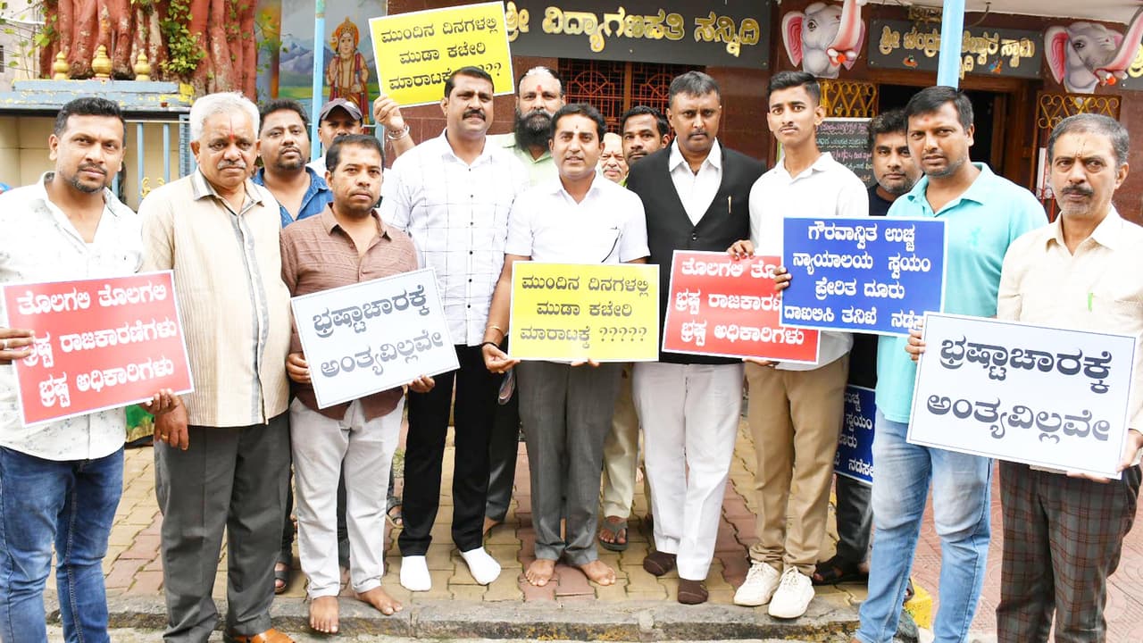 ಮೈಸೂರು ನಗರಾಭಿವೃದ್ಧಿ ಪ್ರಾಧಿಕಾರದಲ್ಲಿ (ಎಂಡಿಎ) 50:50 ನಿವೇಶನ ಹಂಚಿಕೆಯಲ್ಲಿನ ಬಹುಕೋಟಿ ಹಗರಣದ ಕುರಿತು ಹೈಕೋರ್ಟ್ ಸ್ವಯಂ ಪ್ರೇರಿತ ದೂರು ದಾಖಲಿಸಿಕೊಂಡು ತನಿಖೆ ನಡೆಸುವಂತೆ ಆಗ್ರಹಿಸಿ ಪಿಜಿ ಜನಸ್ಪಂದನ ಫೌಂಡೇಷನ್ ವತಿಯಿಂದ ನಗರದ ಡಿ. ದೇವರಾಜ ಅರಸು ರಸ್ತೆ- ನಾರಾಯಣಶಾಸ್ತ್ರಿ ರಸ್ತೆ ಜಂಕ್ಷನ್ ನಲ್ಲಿ ಗುರುವಾರ ಪ್ರತಿಭಟಿಸಿದರು.ಎಂಡಿಎ ಹಗರಣದ ಕುರಿತು ವಿವಿಧ ರಾಜಕೀಯ ಪಕ್ಷದ ಕೆಲವು ಮುಖಂಡರು ಮತ್ತು ಚುನಾಯಿತು ಜನಪ್ರತಿನಿಧಿಗಳು, ಕೆಲವು ಆರ್.ಟಿ.ಐ ಕಾರ್ಯಕರ್ತರು ವಿಭಿನ್ನ ಹೇಳಿಕೆ ನೀಡುತ್ತಾ, ಸಾರ್ವಜನಿಕ ವಲಯದಲ್ಲಿ ಗೊಂದಲ ಸೃಷ್ಟಿಸುತ್ತಿದ್ದಾರೆ. ಎಂಡಿಎ ಅಧ್ಯಕ್ಷರೇ ಹಗರಣ ನಡೆದಿರುವುದನ್ನು ಒಪ್ಪಿಕೊಂಡಿದ್ದಾರೆ. ಜೊತೆಗೆ ರಾಜ್ಯ ಸರ್ಕಾರ ಹಗರಣದ ತನಿಖೆಗೆ ಐಎಎಸ್ ಅಧಿಕಾರಿಗಳ ತಂಡ ನೇಮಿಸಿದ್ದು, ಜಿಲ್ಲಾಧಿಕಾರಿ, ಎಂಡಿಎ ಆಯುಕ್ತರನ್ನು ವರ್ಗಾಯಿಸಿರುವುದನ್ನು ನೋಡಿದರೆ ಹಗರಣ ನಡೆದಿರುವುದು ಸ್ಪಷ್ಟವಾಗುತ್ತದೆ ಎಂದು ಅವರು ದೂರಿದ್ದಾರೆ.