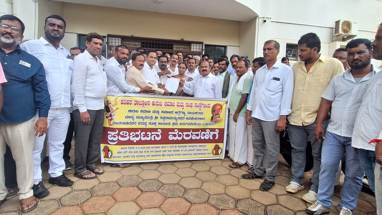 ಕುರುಬ ಸಮಾಜ ಹಾಗೂ ಮುಖ್ಯಮಂತ್ರಿ ಸಿದ್ದರಾಮಯ್ಯ ಬಗ್ಗೆ ಅವಹೇಳನವಾಗಿ ಮಾತನಾಡಿದವರ ವಿರುದ್ಧ ಕಠಿಣ ಕಾನೂನು ಕ್ರಮ ಕೈಗೊಳ್ಳುವಂತೆ ಒತ್ತಾಯಿಸಿ ಹರಿಹರ ತಾಲೂಕು ಕುರುಬರ ಸಂಘದಿಂದ ಮಂಗಳವಾರ ಗ್ರೇಡ್-2 ತಹಸೀಲ್ದಾರ್ ಪುಷ್ಪಾವತಿ ಮೂಲಕ ಸರ್ಕಾರಕ್ಕೆ ಮನವಿ ಸಲ್ಲಿಸಲಾಯಿತು.