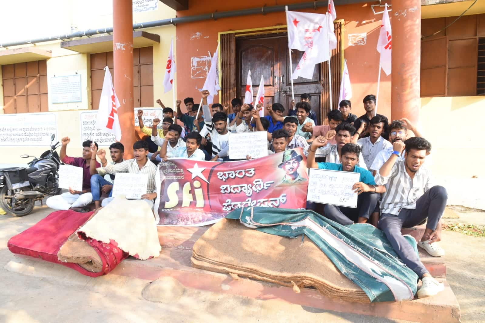 ಹಾಸ್ಟೆಲ್ ವಿದ್ಯಾರ್ಥಿಗಳಿಗೆ ಮೂಲಭೂತ ಸೌಕರ್ಯಗಳಿಂದ ವಂಚನೆ ವಿರೋಧಿಸಿ, ಕೂಡಲೇ ಸೌಲಭ್ಯ ವಿತರಣೆ ಮಾಡುವಂತೆ ಆಗ್ರಹಿಸಿ ಎಸ್ಎಫ್ಐ ಜಿಲ್ಲಾ ಸಮಿತಿ ನೇತೃತ್ವದಲ್ಲಿ ನಗರದ ಹೊರವಲಯದ ಆರ್ಟಿಒ ಕಚೇರಿ ಬಳಿಯ ಸಮಾಜ ಕಲ್ಯಾಣ ಇಲಾಖೆಯ ಬಿ.ಆರ್. ಅಂಬೇಡ್ಕರ್ ಸರ್ಕಾರಿ ಮೆಟ್ರಿಕ್ ನಂತರದ ಬಾಲಕರ ವಿದ್ಯಾರ್ಥಿ ನಿಲಯದ ಎದುರು ವಿದ್ಯಾರ್ಥಿಗಳು ಧರಣಿ ನಡೆಸಿದರು.