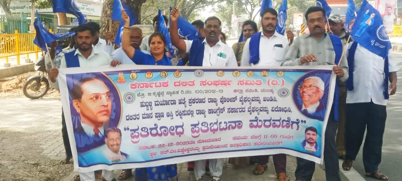ಹುಬ್ಬಳ್ಳಿಯ ಇನಾಂ ವೀರಪುರ ಗ್ರಾಮದಲ್ಲಿ ಕಳೆದ 7 ತಿಂಗಳ ಹಿಂದೆ ದಲಿತ ಯುವಕ ವಿವೇಕಾನಂದನನ್ನು ಪ್ರೀತಿಸಿ ಅನ್ಯ ಜಾತಿಯ ಮಾನ್ಯ ಎಂಬುವವರು ವಿವಾಹವಾದ ಕಾರಣಕ್ಕೆ ಹೆತ್ತ ತಂದೆಯೇ ಮರ್ಯಾದಾ ಹತ್ಯೆ ನಡೆಸಿರುವುದನ್ನು ಖಂಡಿಸಿದರು.ದಸಂಸ ರಾಜ್ಯಾಧ್ಯಕ್ಷ ವೆಂಕಟಗಿರಿಯಯ್ಯ ಮಾತನಾಡಿ, ಹುಬ್ಬಳ್ಳಿ ಮರ್ಯಾದಾ ಹತ್ಯೆ ಪ್ರಕರಣದ ಪೂರ್ವದ ಅರಿವಿದ್ದರೂ ಹತ್ಯೆಯನ್ನು ತಡೆಯಲಾಗದೆ ಕೈಚೆಲ್ಲಿದ ಪೋಲೀಸರ ವೈಫಲ್ಯಕ್ಕೆ ಜಿಲ್ಲಾ ಪೋಲೀಸ್ ವರಿಷ್ಠಾಧಿಕಾರಿಯನ್ನು ಈ ಕೂಡಲೇ ಸೇವೆಯಿಂದ ವಜಾಗೊಳಿಸಬೇಕು ಮತ್ತು ರಾಜ್ಯ ಸರ್ಕಾರ ತನ್ನ ವೈಫಲ್ಯದ ನೈತಿಕ ಹೊಣೆ ಹೊರಬೇಕು ಎಂದು ಆಗ್ರಹಿಸಿದರು.