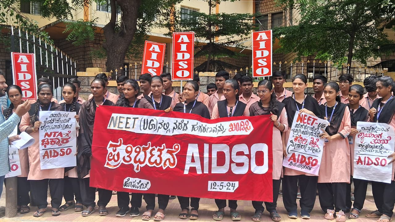 ಹೊಸಪೇಟೆ: ವೈದ್ಯಕೀಯ ಕೋರ್ಸ್ ಪ್ರವೇಶಾತಿಗೆ ನಡೆಸುವ ನೀಟ್ ಪರೀಕ್ಷಾ ಹಗರಣದ ಸಮಗ್ರ ತನಿಖೆ ನಡೆಸಬೇಕು ಎಂದು ಆಲ್ ಇಂಡಿಯಾ ಡೆಮಾಕ್ರಟಿಕ್ ಸ್ಟೂಡೆಂಟ್ಸ್ ಆರ್ಗನೈಸೇಷನ್ (ಎಐಡಿಎಸ್ಒ) ಸಂಘಟನೆ ನೇತೃತ್ವದಲ್ಲಿ ವಿಜಯನಗರ ಜಿಲ್ಲೆಯ ವಿದ್ಯಾರ್ಥಿಗಳು ಇಲ್ಲಿನ ತಹಸೀಲ್ದಾರ್ ಕಚೇರಿ ಎದುರು ಬುಧವಾರ ಪ್ರತಿಭಟನೆ ನಡೆಸಿದರು.ಎಐಡಿಎಸ್ಒ ರಾಜ್ಯ ಸಮಿತಿ ಸದಸ್ಯ ರವಿಕಿರಣ್ ಜೆ.ಪಿ. ಮಾತನಾಡಿ, ಕೇಂದ್ರದಲ್ಲಿ ಎನ್ಎಂಸಿ ಜಾರಿ ಮಾಡುವಾಗ ಎಐಡಿಎಸ್ಒ ವಿದ್ಯಾರ್ಥಿ ಸಂಘಟನೆ ತೀವ್ರ ವಿರೋಧ ವ್ಯಕ್ತಪಡಿಸಿತ್ತು. ವೈದ್ಯರು, ಪ್ರೊಫೆಸರ್ಗಳು, ತಜ್ಞರಿದ್ದ ಎಚ್ಸಿಎಂಐ ಅನ್ನು ರದ್ದುಪಡಿಸಿ ಆರೋಗ್ಯ ವ್ಯವಸ್ಥೆಗೆ ಸಂಬಂಧ ಇಲ್ಲದ ಕಾರ್ಪೊರೇಟ್ ಮನೆತನದ ಒಡೆಯರನ್ನೊಳಗೊಂಡ ಸಮಿತಿಯಾದ ಎನ್ಎಂಸಿಯನ್ನು ಕೇಂದ್ರ ಸರ್ಕಾರ ಜಾರಿಗೊಳಿಸಿತು. ರಾಜ್ಯ ಮಟ್ಟದಲ್ಲಿ ನಡೆಯುತ್ತಿದ್ದ ಪ್ರವೇಶ ಪರೀಕ್ಷೆಗಳಲ್ಲಿ ಭ್ರಷ್ಟಾಚಾರ ನಡೆಯುತ್ತಿದೆ ಎನ್ನುವ ನೆಪವೊಡ್ಡಿ ಈ ಎನ್ಎಂಸಿಯು ಅಖಿಲ ಭಾರತ ಮಟ್ಟದಲ್ಲಿ ಒಂದು ಪ್ರವೇಶ ಪರೀಕ್ಷೆ ಜಾರಿ ಮಾಡಿತು. ಆಗ ನಡೆಯುತ್ತಿದ್ದ ಭ್ರಷ್ಟಾಚಾರದ ಕುರಿತು ತನಿಖೆ ನಡೆಸಿ ಸಂಬಂಧಪಟ್ಟವರಿಗೆ ಸೂಕ್ತ ಶಿಕ್ಷೆ ವಿಧಿಸುವ ಬದಲಿಗೆ ಪರೀಕ್ಷಾ ಪದ್ಧತಿ ಬದಲಾಯಿಸುವುದು ಪರಿಹಾರವಲ್ಲ ಎಂದು ನಾವು ಆ ಸಂದರ್ಭದಲ್ಲಿ ಎಚ್ಚರಿಕೆ ನೀಡಿದ್ದೆವು. ನಮ್ಮಎಚ್ಚರಿಕೆ ಈಗ ನಿಜವಾಗಿದೆ. ಸರ್ಕಾರದ ನಿಷ್ಕಾಳಜಿ ಮತ್ತು ಪರೀಕ್ಷಾ ವ್ಯವಸ್ಥೆಯ ಸಂಪೂರ್ಣ ವ್ಯಾಪಾರೀಕರಣದಿಂದಾಗಿ, ಇಡೀ ವೈದ್ಯಕೀಯ ಪ್ರವೇಶ ಪರೀಕ್ಷೆ ಕುಸಿತಕ್ಕೊಳಗಾಗುತ್ತಿದೆ ಎಂದು ದೂರಿದರು.