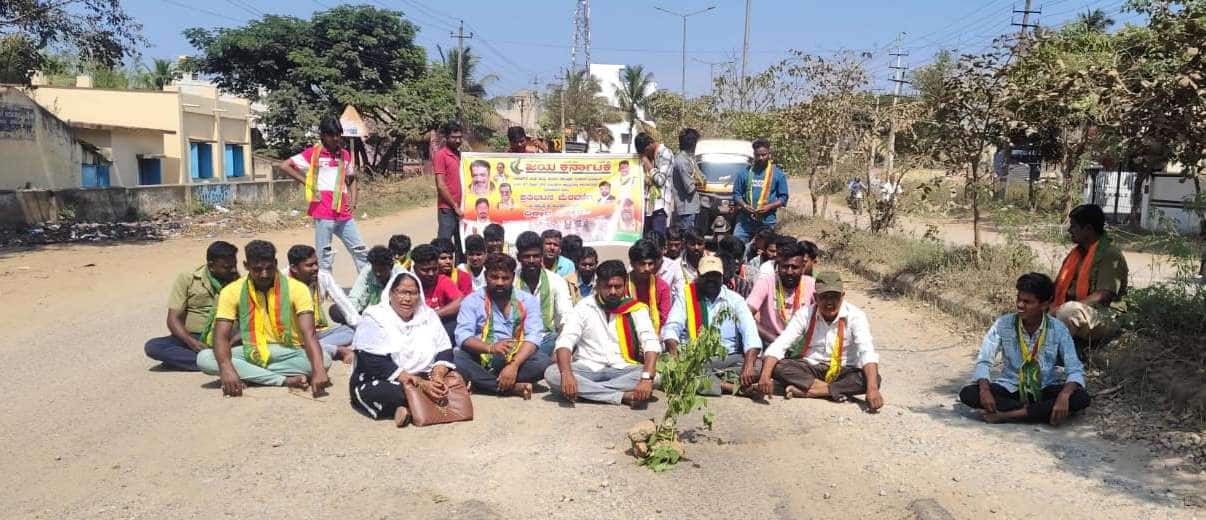 ನಗರದಲ್ಲಿ ಹಾದು ಹೋಗಿರುವ ರಾಜ್ಯ ಹೆದ್ದಾರಿಗಳನ್ನು ದುರಸ್ತಿಪಡಿಸಲು ಆಗ್ರಹಿಸಿ ಜಯ ಕರ್ನಾಟಕ ಸಂಘಟನೆಯ ತಾಲೂಕು ಘಟಕದಿಂದ ನಗರದಲ್ಲಿ ಗುರುವಾರ ಪ್ರತಿಭಟನೆ ನಡೆಸಿ ಪಿಡಬ್ಲ್ಯುಡಿ ಎಇಇ ಮರಿಸ್ವಾಮಿ ಅವರಿಗೆ ಮನವಿ ನೀಡಲಾಯಿತು.