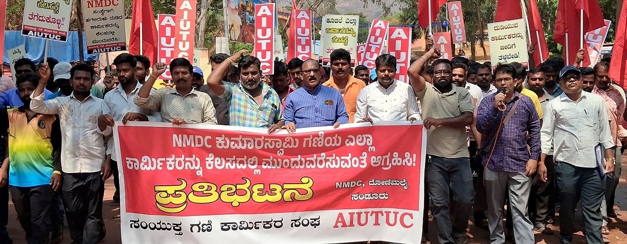 ಸಂಡೂರು: ತಾಲೂಕಿನಲ್ಲಿರುವ ಕೇಂದ್ರ ಸರ್ಕಾರಿ ಸ್ವಾಮ್ಯದ ಎನ್ಎಂಡಿಸಿಯ ಕುಮಾರಸ್ವಾಮಿ ಗಣಿಯ ಎಲ್ಲ ಕಾರ್ಮಿಕರನ್ನು ಕೆಲಸದಲ್ಲಿ ಮುಂದುವರೆಸುವಂತೆ ಆಗ್ರಹಿಸಿ ಕಾರ್ಮಿಕರು ಎಐಯುಟಿಯುಸಿಗೆ ಸಂಯೋಜನೆಗೊಂಡ ಸಂಯುಕ್ತ ಗಣಿ ಕಾರ್ಮಿಕರ ಸಂಘದ ನೇತೃತ್ವದಲ್ಲಿ ದೋಣಿಮಲೈನಲ್ಲಿರುವ ಎನ್ಎಂಡಿಸಿ ಕಚೇರಿ ಮುಂದೆ ಪ್ರತಿಭಟನೆ ನಡೆಸಿದರು.