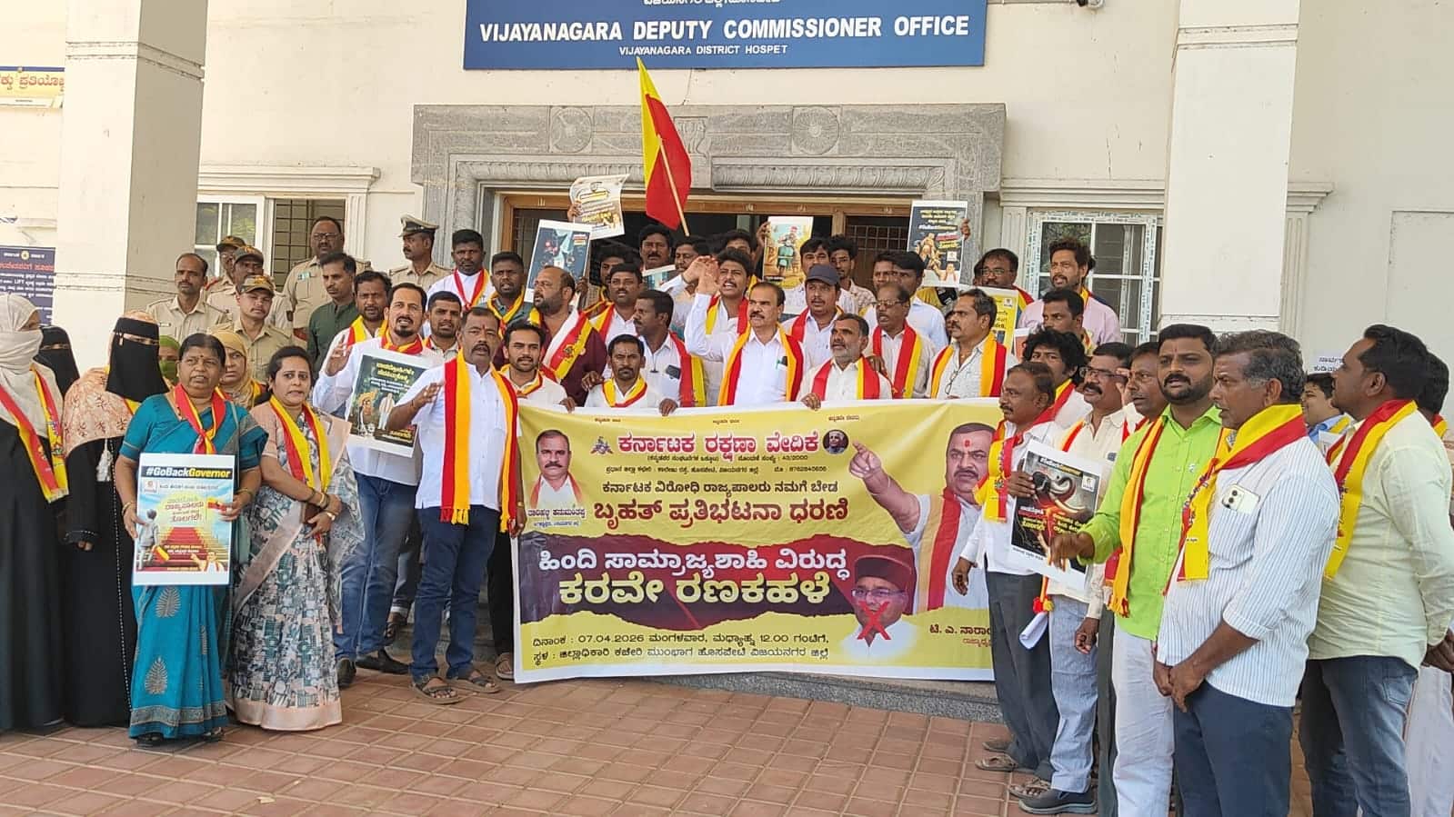 ಹೊಸಪೇಟೆ: ಹಿಂದಿ ಸಾಮ್ರಾಜ್ಯಶಾಹಿಗಳ ಪರ ನಿಲುವು, ಕರ್ನಾಟಕ ವಿರೋಧಿ ಧೋರಣೆ ತಳೆದಿರುವ ರಾಜ್ಯಪಾಲ ಥಾವರ್ ಚಂದ್ ಗೆಹೆಲೋತ್ ಅವರನ್ನು ಕೇಂದ್ರ ಸರ್ಕಾರ ಕೂಡಲೇ ಹಿಂದಕ್ಕೆ ಕರೆಯಿಸಿಕೊಳ್ಳಬೇಕು ಎಂದು ಒತ್ತಾಯಿಸಿ ಕರ್ನಾಟಕ ರಕ್ಷಣಾ ವೇದಿಕೆ ಕಾರ್ಯಕರ್ತರು ಜಿಲ್ಲಾಧಿಕಾರಿ ಕಚೇರಿ ಎದುರು ಮಂಗಳವಾರ ಪ್ರತಿಭಟನೆ ನಡೆಸಿದರು.ರಾಜ್ಯ ಸರ್ಕಾರ ಎಸ್ಸೆಸ್ಸೆಲ್ಸಿ ಪರೀಕ್ಷೆಗಳಲ್ಲಿ ತೃತೀಯ ಭಾಷೆಗೆ ಗ್ರೇಡಿಂಗ್ ವ್ಯವಸ್ಥೆ ಜಾರಿಗೆ ತಂದ ನಿರ್ಧಾರವನ್ನು ಮರುಪರಿಶೀಲಿಸುವಂತೆ ರಾಜ್ಯಪಾಲರು ಮುಖ್ಯ ಕಾರ್ಯದರ್ಶಿಗಳಿಗೆ ಪತ್ರ ಬರೆದಿದ್ದಾರೆ. ಈ ಪತ್ರದ ಹಿಂದೆ ಕರ್ನಾಟಕದಲ್ಲಿ ಹಿಂದಿ ಹೇರಿಕೆಯನ್ನು ಶಾಶ್ವತವಾಗಿ ನಡೆಸುವ ಹುನ್ನಾರವಿದೆ. ರಾಜ್ಯಪಾಲರು ತಮ್ಮ ಕಾರ್ಯವ್ಯಾಪ್ತಿಯನ್ನು ಮೀರಿ ಕನ್ನಡಿಗರ ಆಶೋತ್ತರಗಳಿಗೆ ವಿರುದ್ಧವಾಗಿ ನಡೆದುಕೊಂಡಿದ್ದಾರೆ. ಹೀಗಾಗಿ, ಅವರು ಕರ್ನಾಟಕದಲ್ಲಿ ಒಂದೇ ಒಂದು ನಿಮಿಷವೂ ರಾಜ್ಯಪಾಲರಾಗಿ ಉಳಿಯುವ ನೈತಿಕತೆಯನ್ನು ಕಳೆದುಕೊಂಡಿದ್ದಾರೆ ಎಂದು ಆಕ್ರೋಶ ವ್ಯಕ್ತಪಡಿಸಿದರು.