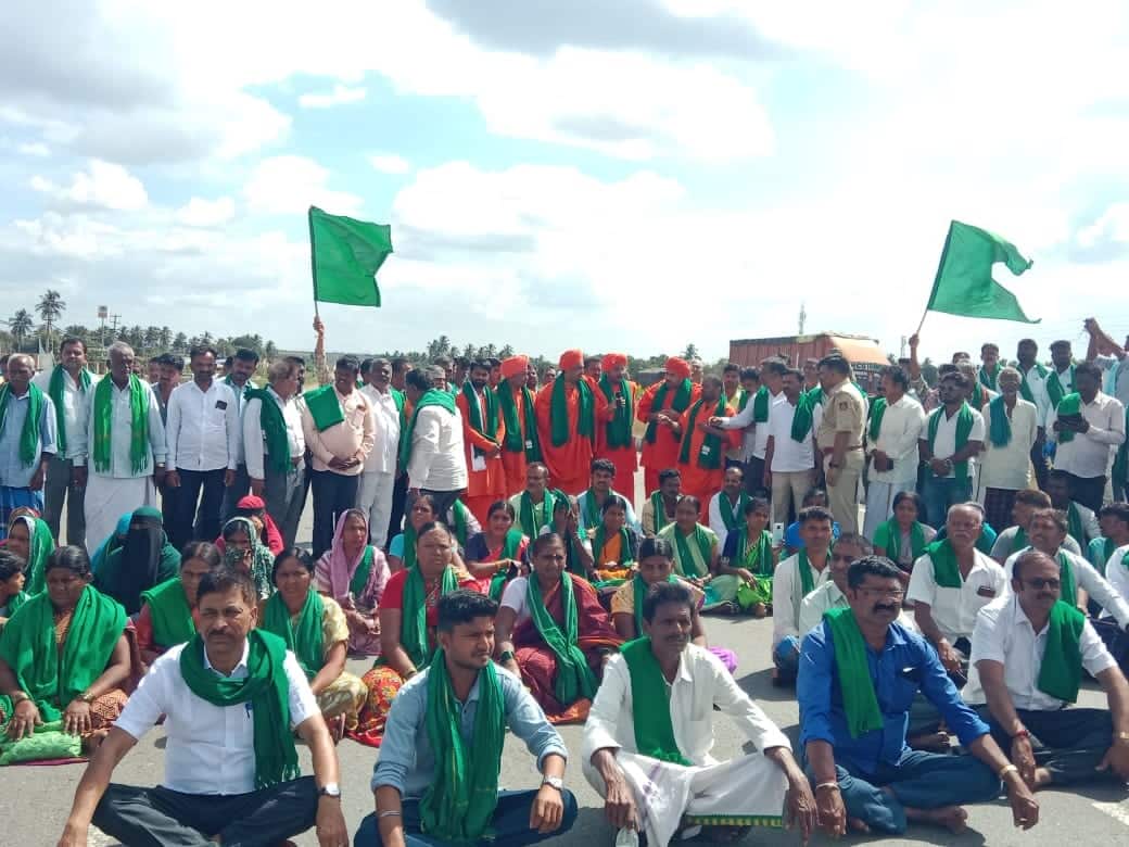 ಮೆಕ್ಕೆಜೋಳಕ್ಕೆ ₹ 3 ಸಾವಿರ ಕನಿಷ್ಠ ಬೆಂಬಲ ಘೋಷಣೆ ಮತ್ತು ಖರೀದಿ ಕೇಂದ್ರ ಸ್ಥಾಪನೆಗೆ ಆಗ್ರಹಿಸಿ ಜಿಲ್ಲಾ ರೈತ ಸಂಘಗಳ ಒಕ್ಕೂಟಗಳ ಸಾಮೂಹಿಕ ನಾಯಕತ್ವದಡಿ ಸೋಮವಾರ ತಾಲೂಕಿನ ಹುಲಿಹಳ್ಳಿ ಬಳಿಯಿರುವ ಮೆಗಾ ಮಾರ್ಕೇಟ್ ಮುಂಭಾಗದಲ್ಲಿ ಸ್ವಲ್ಪ ಹೊತ್ತು ರಾಷ್ಟ್ರೀಯ ಹೆದ್ದಾರಿ ತಡೆದು ಪ್ರತಿಭಟನೆ ನಡೆಸಿದರು.