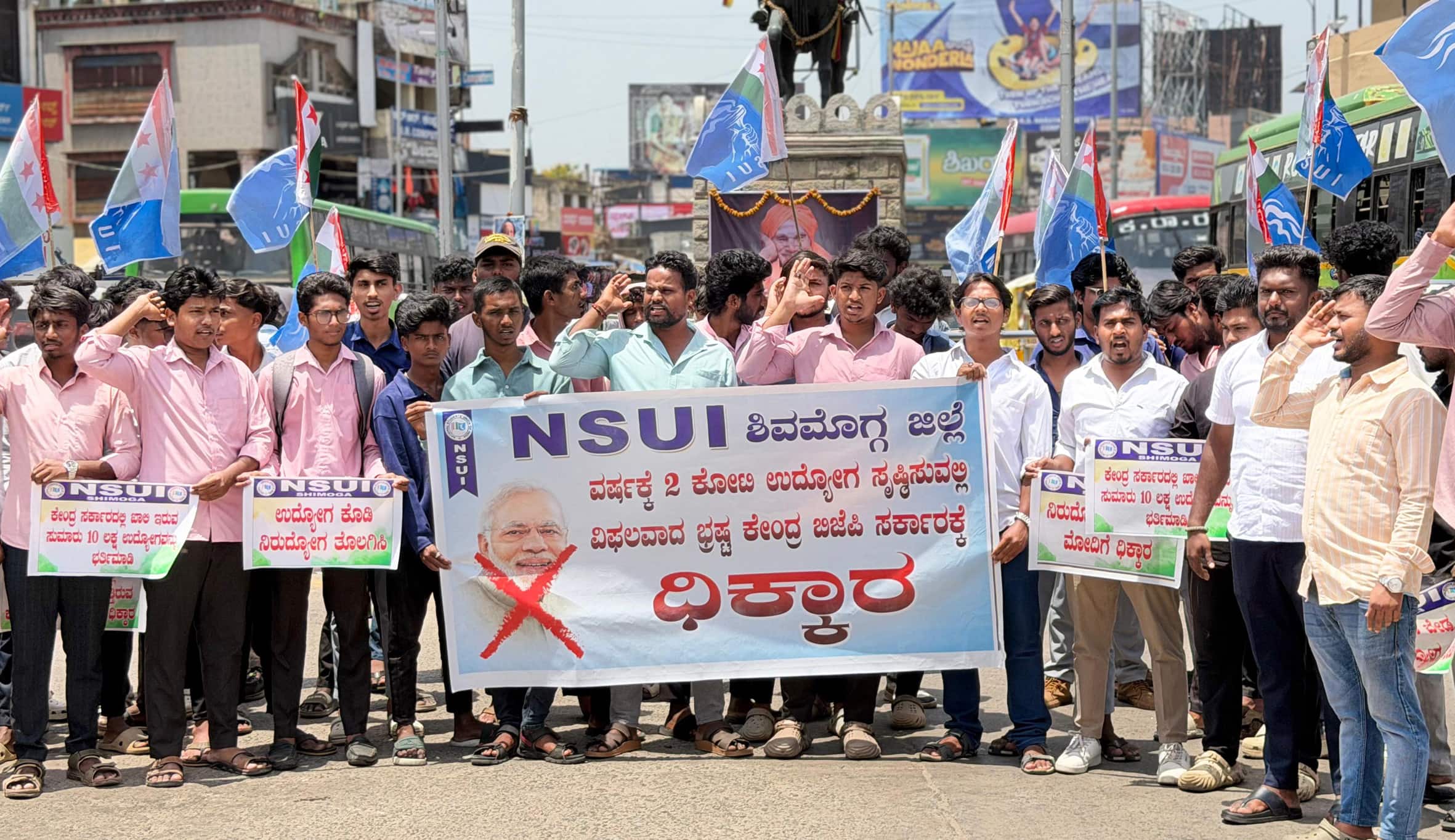 ಕೇಂದ್ರ ಬಿಜೆಪಿ ಸರ್ಕಾರದಲ್ಲಿ ಖಾಲಿ ಇರುವ ಹುದ್ದೆಗಳನ್ನು ಭರ್ತಿ ಮಾಡದೇ ಯುವ ಜನತೆಗೆ ಅನ್ಯಾಯವೆಸಗುತ್ತಿರುವ ಕೇಂದ್ರ ಸರ್ಕಾರವನ್ನು ವಜಾಗೊಳಿಸಲು ಆಗ್ರಹಿಸಿ ಶಿವಮೊಗ್ಗ ಜಿಲ್ಲಾ ಎನ್.ಎಸ್.ಯು.ಐ.ವತಿಯಿಂದ ನಗರದ ಶಿವಪ್ಪನಾಯಕ ವೃತ್ತದಲ್ಲಿ ಪ್ರತಿಭಟನೆ ನಡೆಸಲಾಯಿತು.ಕೇಂದ್ರ ಸರ್ಕಾರದಲ್ಲಿ ಹಲವಾರು ವರ್ಷಗಳಿಂದ ನೇಮಕಾತಿ ಕೈಗೊಳ್ಳದೇ 10 ಲಕ್ಷಕ್ಕೂ ಹೆಚ್ಚು ಹುದ್ದೆಗಳನ್ನು ಖಾಲಿ ಬಿಟ್ಟಿರುವ ಕೇಂದ್ರ ಸರ್ಕಾರದ ಕ್ರಮವನ್ನು ಶಿವಮೊಗ್ಗ ಜಿಲ್ಲಾ ಎನ್.ಎಸ್.ಯು.ಐ. ಖಂಡಿಸುತ್ತಿದೆ. ನರೇಂದ್ರ ಮೋದಿಯವರು ಬಿಜೆಪಿ ಅಧಿಕಾರಕ್ಕೆ ಬಂದರೆ ಪ್ರತಿ ವರ್ಷ 2 ಕೋಟಿ ಉದ್ಯೋಗ ಸೃಷ್ಟಿಸುವುದಾಗಿ ಭರವಸೆ ನೀಡಿ ಅಧಿಕಾರದ ಚುಕ್ಕಾಣಿ ಹಿಡಿದಿದ್ದರು. ನರೇಂದ್ರ ಮೋದಿಯವರು ಮೂರನೇ ಬಾರಿ ಪ್ರಧಾನಿಯಾಗಿ ಕಾರ್ಯ ನಿರ್ವಹಿಸುತ್ತಿದ್ದಾರೆ. ಆದರೆ, ಇದುವರೆಗೂ ವರ್ಷಕ್ಕೆ 2 ಕೋಟಿ ಉದ್ಯೋಗ ಸೃಷ್ಟಿ ಮಾಡುವುದರ ಬದಲಿಗೆ ಕೋಟ್ಯಂತರ ನಿರುದ್ಯೋಗಿಗಳನ್ನು ಸೃಷ್ಟಿಸುತ್ತಿದ್ದಾರೆ ಎಂದು ದೂರಿದರು.