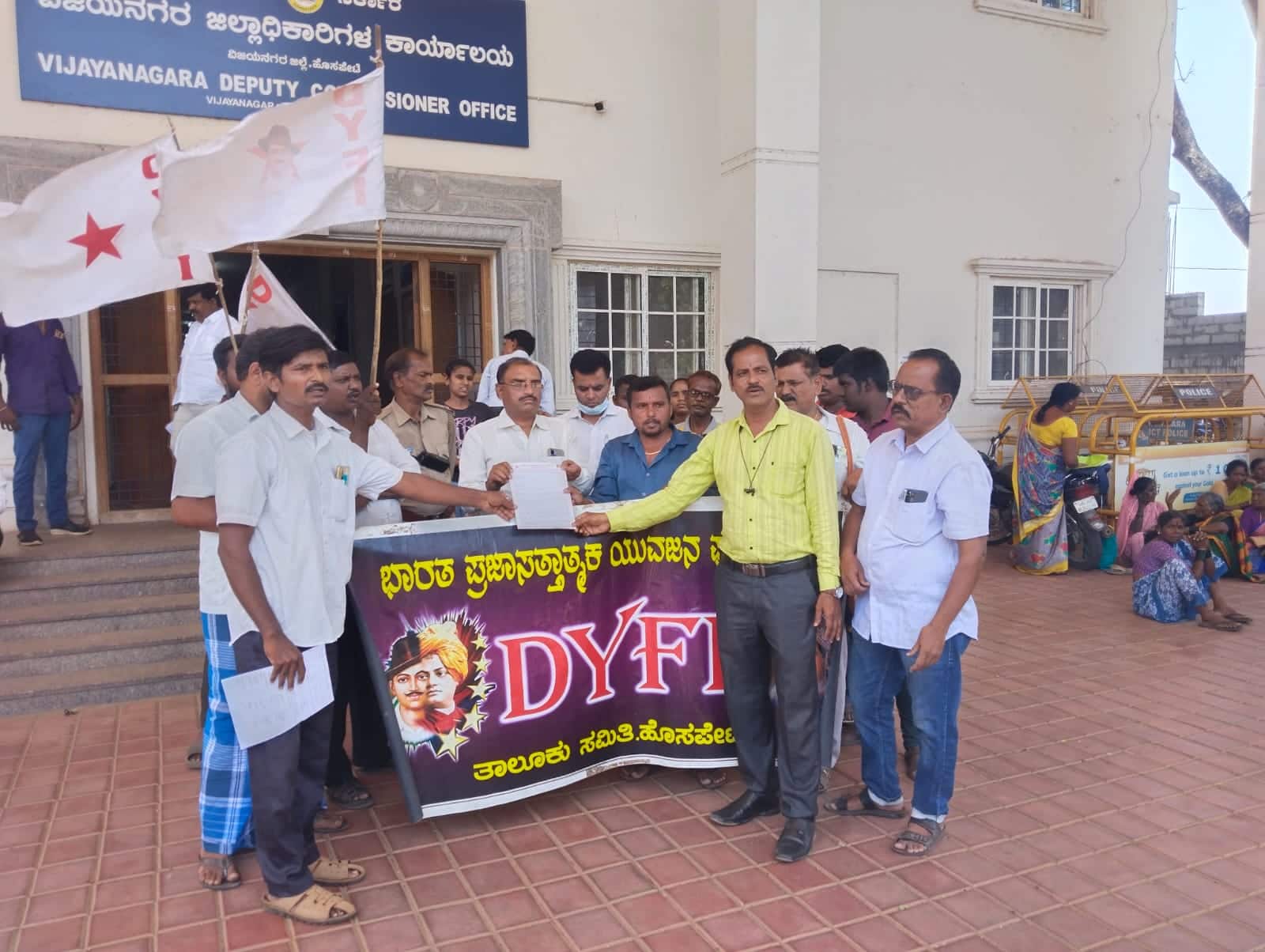 ವಿಜಯನಗರ ಜಿಲ್ಲಾಸ್ಪತ್ರೆಯಲ್ಲಿ ವಿವಿಧ 235 ಹುದ್ದೆಗಳ ನೇಮಕಾತಿಯಲ್ಲಿ ಸ್ಥಳೀಯ ನಿರುದ್ಯೋಗಿ ಯುವಕರಿಗೆ ಆದ್ಯತೆ ನೀಡಬೇಕು ಎಂದು ಒತ್ತಾಯಿಸಿ ಡಿವೈಎಫ್ಐ ಸಂಘಟನೆಯ ಪದಾಧಿಕಾರಿಗಳು ಪ್ರತಿಭಟನೆ ನಡೆಸಿದರು.