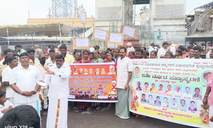 ಶ್ರೀ ಕ್ಷೇತ್ರದಲ್ಲಿ ಮಲೆ ಮಾದೇಶ್ವರ ಬೆಟ್ಟ ಶ್ರೀ ಕ್ಷೇತ್ರದಲ್ಲಿ ವಿಷ ಪ್ರಸಾದ ತಿಂದ ಸಂತ್ರಸ್ತರು ಮಾರ್ಟಳ್ಳಿ, ಎಂಜಿ ದೊಡ್ಡಿ, ಬಿದರಳ್ಳಿ, ಸುಳ್ವಾಡಿ ಹಾಗೂ ವಿವಿಧ ಗ್ರಾಮಗಳ ನೂರಾರು ಸಂತ್ರಸ್ತರು ಮಲೆ ಮಾದೇಶ್ವರ ಬೆಟ್ಟದಲ್ಲಿ ಪ್ರತಿಭಟನೆ ನಡೆಸಿ ಮೆರವಣಿಗೆ ಮೂಲಕ ಮೃತಪಟ್ಟವರ ಫೋಟೋ ಇರುವ ಬ್ಯಾನರ್ ಹಿಡಿದು ಮಲೆ ಮಾದೇಶ್ವರ ಬೆಟ್ಟದ ರಾಜಗೋಪುರದಿಂದ ವಿವಿಧೆಡೆ ಪ್ರತಿಭಟನೆ ನಡೆಸಿ ಮೆರವಣಿಗೆ ಮೂಲಕ ತಮ್ಮ ಆಕ್ರೋಶವನ್ನು ವ್ಯಕ್ತಪಡಿಸಿದರು.ಸಾಮಾಜಿಕ ಕಾರ್ಯಕರ್ತ ಪಿ.ಜಿ. ಮಣಿ ಮಾತನಾಡಿ, ರಾಷ್ಟ್ರ ರಾಜ್ಯಮಟ್ಟದಲ್ಲಿ ಸದ್ದು ಮಾಡಿದ್ದ ಸುಳ್ಳಾಡಿ ವಿಷ ಪ್ರಸಾದದ ದುರಂತದಲ್ಲಿ ಮಡಿದಂತ 17 ಜನಕ್ಕೆ ಅವರ ಕುಟುಂಬಕ್ಕೆ ಸರ್ಕಾರದಿಂದ ಸಿಗಬೇಕಾದ ನಿವೇಶನ ಹಾಗೂ ಜಮೀನು, ಪರಿಹಾರ ಸಮರ್ಪಕವಾಗಿ ಇನ್ನೂ ಸಹ ನೀಡಿಲ್ಲ. 150ಕ್ಕೂ ಹೆಚ್ಚು ಜನ ವಿಷ ಪ್ರಸಾದ ತಿಂದು ಕಳೆದ ಏಳು ವರ್ಷಗಳಿಂದ ಇನ್ನೂ ಸಹ ವಿವಿಧ ನೂನ್ಯತೆಗಳಿಂದ ಭಾದಿತರಾಗಿ ಸಂಕಷ್ಟದಲ್ಲಿರುವ ಸಂತ್ರಸ್ತರ ನೆರವಿಗೆ ಸರ್ಕಾರ ಶಾಶ್ವತ ಪರಿಹಾರ ನೀಡಿಲ್ಲ. ಜೊತೆಗೆ ಬಾಧಿತರು ಗುಣಮುಖರಾಗದೆ ಸಂಕಷ್ಟದಲ್ಲಿ ಇರುವ ಸಂತ್ರಸ್ತರಿಗೆ ಸರಿಯಾದ ಆರೋಗ್ಯ ಸೇವೆಗಳು ಸಹ ಸಿಗುತ್ತಿಲ್ಲ. ಆಹಾರ ಕಿಟ್ ಗಳನ್ನು ಸಹ ಸಕಾಲದಲ್ಲಿ ನೀಡದೆ