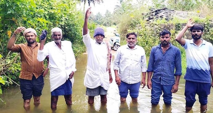 9ಕೆಎಂಎನ್ ಡಿ16ಕೆ.ಆರ್.ಪೇಟೆ ತಾಲೂಕಿನ ಸಾದುಗೋನಹಳ್ಳಿ ಬಳಿ ಸೀಳುಗಾಲುವೆಯ ನೀರು ರಸ್ತೆ ಮೇಲೆ ಉರುಳಿರುವುದನ್ನು ಖಂಡಿಸಿ ರೈತರು ಪ್ರತಿಭಟಿಸಿದರು.