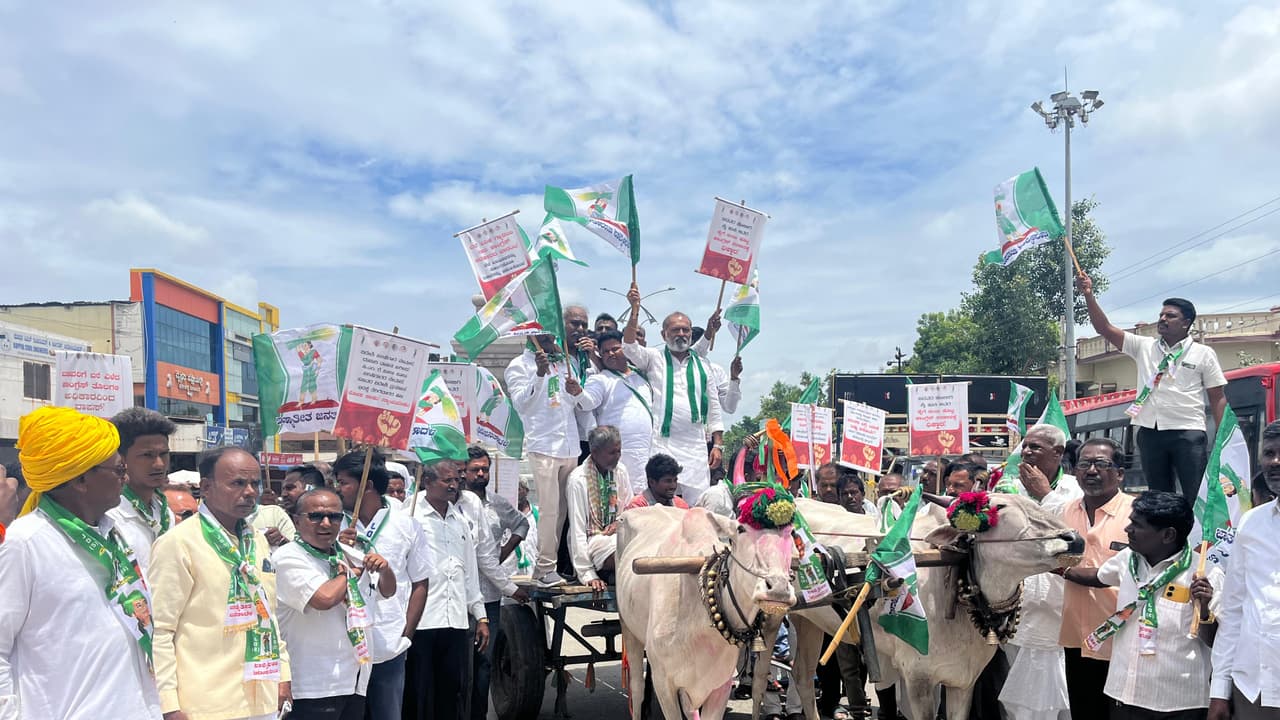 ತೈಲ, ಹಾಲು ಬೆಲೆ ಏರಿಕೆ ವಿರೋಧಿಸಿ ಎತ್ತಿನಬಂಡಿಯೊಂದಿಗೆ ನಗರದಲ್ಲಿ ಜೆಡಿಎಸ್ ಕಾರ್ಯಕರ್ತರು ಗುರುವಾರ ಪ್ರತಿಭಟನೆ ನಡೆಸಿದರು.