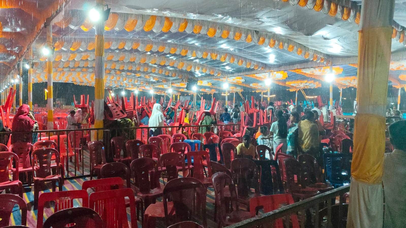 ಬೈಲಹೊಂಗಲ: ಮಂಗಳವಾರ ಸಂಜೆ ಸುರಿದ ಧಾರಾಕಾರ ಅಕಾಲಿಕ ಮಳೆ ತಾಲೂಕಿನ ಸಂಗೊಳ್ಳಿ ಗ್ರಾಮದಲ್ಲಿ ಜಿಲ್ಲಾಡಳಿತ, ಕನ್ನಡ ಮತ್ತು ಸಂಸ್ಕೃತಿ ಇಲಾಖೆ ಹಮ್ಮಿಕೊಂಡಿದ್ದ ನಡೆದ ಕ್ರಾಂತಿವೀರ ಸಂಗೊಳ್ಳಿ ರಾಯಣ್ಣ ಉತ್ಸವದ ಎರಡನೇ ದಿನದ ಕಾರ್ಯಕ್ರಮದಲ್ಲಿ ಅವಾಂತರ ಸೃಷ್ಟಿ ಮಾಡಿತು. ಸಂಜೆ ಸುರಿದ ಮಳೆಗೆ ಸಾಂಸ್ಕೃತಿಕ ಕಾರ್ಯಕ್ರಮಗಳಿಗೆ ಅಡ್ಡಿವುಂಟಾಯಿತು. ಅರ್ಧಗಂಟೆಗೂ ಹೆಚ್ಚು ಕಾಲ ಮಳೆ ಸುರಿದ್ದರಿಂದ ಮುಖ್ಯ ವೇದಿಕೆಯೇ ಮಳೆಯಿಂದ ನೀರು ಸೋರಿದ್ದರಿಂದ ಕಾರ್ಯಕ್ರಮ ಸಂಪೂರ್ಣ ಸ್ಥಬ್ಧವಾಯಿತು. ಸ್ಥಳೀಯ ಕಲಾವಿದರು, ರಾಜ್ಯ ಮಟ್ಟದ ಕಲಾವಿದರು, ಪ್ರೇಕ್ಷಕರು, ಗ್ರಾಮಸ್ಥರು ಹಮ್ಮಿಕೊಂಡಿದ್ದ ಸಾಂಸ್ಕೃತಿಕ ಕಾರ್ಯಕ್ರಮಗಳಿಗೆ ಮಳೆಯಿಂದ ಅಡ್ಡಿವುಂಟಾಯಿತು. ಧಾರಕಾರ ಮಳೆಯಾಗಿದ್ದರಿಂದ ಕಾರ್ಯಕ್ರಮ ವೀಕ್ಷಿಸುವ ಜನರು ಮಳೆಯಲ್ಲಿಯೇ ನೆನೆಯಬೇಕಾಯಿತು. ಕೊನೆಗೆ ಕುರ್ಚಿಗಳನ್ನೇ ಹೊತ್ತುಕೊಂಡು ಜನರು ಮಳೆಯಿಂದ ರಕ್ಷಣೆ ಪಡೆಯಬೇಕಾಯಿತು. ಪಕ್ಕದ ಶಾಲೆ ಕಟ್ಟಡಕ್ಕೆ ತೆರಳಿ ಕೊಠಡಿಗಳಲ್ಲಿ ಆಶ್ರಯ ಪಡೆದು ನಿಂತರು. ದೂರದ ಊರುಗಳಿಂದ ಬಂದಿದ್ದ ಕಲಾವಿದರು, ಕಲಾ ತಂಡಗಳು, ಕಲಾ ಪ್ರೇಕ್ಷಕರು ಮಳೆ ಬಂದು ಸಾಂಸ್ಕೃತಿಕ ಕಾರ್ಯಕ್ರಮಗಳು ಸ್ಥಗಿತಗೊಂಡಿದ್ದರಿಂದ ನಿರಾಶೆಗೊಂಡರು. ಮುಖ್ಯ ವೇದಿಕೆಯ ಮೈದಾನ ಮಳೆ ನೀರಿನಿಂದ ಜಲಾವೃತಗೊಂಡಿತು. ಅಧಿಕಾರಿಗಳು, ಪೊಲೀಸ್ ಸಿಬ್ಬಂದಿ, ಪೋಟೋ, ವಿಡಿಯೋಗ್ರಾಫರಗಳು, ಮಾಧ್ಯಮ ಸ್ನೇಹಿತರು ಮಳೆಯಲ್ಲಿ ನೆನೆಯಬೇಕಾಯಿತು