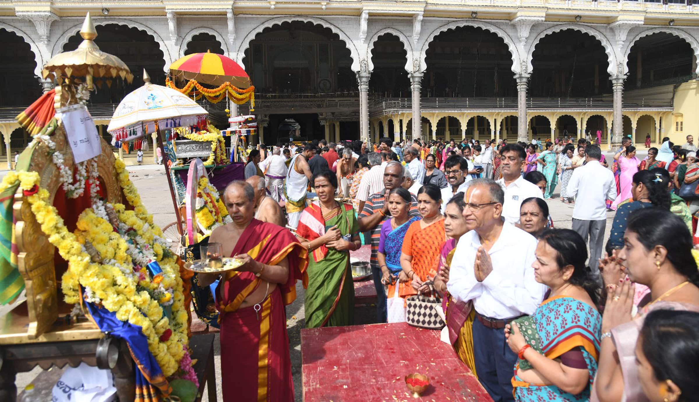 ಬೆಳಗ್ಗೆ 9 ಗಂಟೆಯಿಂದ ಮಧ್ಯಾಹ್ನ 12 ಗಂಟೆವರೆಗೆ ದರ್ಶನಕ್ಕೆ ಅವಕಾಶ ಕಲ್ಪಿಸಲಾಗಿತ್ತು. ನಗರದ ವಿವಿಧ ಬಡಾವಣೆಗಳಿಂದ ನೂರಾರು ಮಂದಿ ಅರಮನೆಗೆ ಆಗಮಿಸಿ ದೇವರ ದರ್ಶನ ಪಡೆದರು. ಒಂದೇ ಕಡೆ 8 ದೇವರುಗಳನ್ನು ಕಂಡು ಭಕ್ತರು ಪುಳಕಿತರಾದರು.ಜತೆಗೆ ಲೋಕ ಕಲ್ಯಾಣಕ್ಕಾಗಿ ರಥಸಪ್ತಮಿ ಆಚರಣೆ ಮಾಡಿದ್ದು, ದರ್ಶನಕ್ಕೆ ಬರುವ ಭಕ್ತರು ಎಲ್ಲ ದೇವರುಗಳನ್ನು ಒಂದೇ ಕಡೆ ನೋಡಬಹುದಲ್ಲದೆ ಗರ್ಭಗುಡಿಯಲ್ಲಿರುವ ಉತ್ಸವ ಮೂರ್ತಿಗಳಿಗೆ ಸೂರ್ಯನ ಕಿರಣ ಬೀಳಲಿ ಎಂಬ ಕಾರಣಕ್ಕೆ ಅರಮನೆ ಮುಂಭಾಗ ಇರಿಸಿ ಪೂಜೆ ಸಲ್ಲಿಸಲಾಯಿತು.