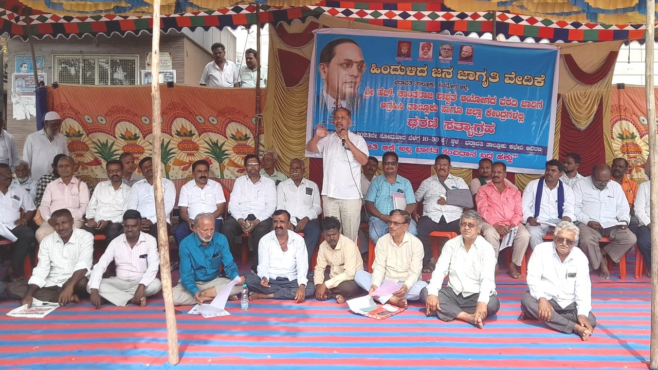 ಹಿಂದುಳಿದ ಜನಜಾಗೃತಿ ವೇದಿಕೆ ವತಿಯಿಂದ ಭದ್ರಾವತಿಯಲ್ಲಿ ಸೋಮವಾರ ತಾಲೂಕು ಕಚೇರಿ ಮುಂಭಾಗ ನಡೆಸಿದ ಧರಣಿಯಲ್ಲಿ ವೇದಿಕೆ ಅಧ್ಯಕ್ಷ ತೀ.ನ. ಶ್ರೀನಿವಾಸ್ ಮಾತನಾಡಿದರು.