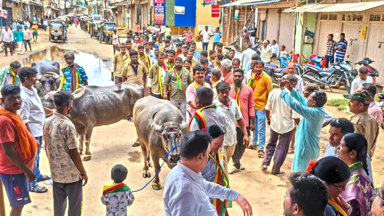 ವಿಧ ಸಮಿತಿಗಳ ನೂರಾರು ಕಾರ್ಯಕರ್ತರು ಭಾನುವಾರ ಅಗಲೀಕರಣ ವಿರೋಧಿಸಿ ಕೋರ್ಟಗೆ ಹೋದವರ ಹೆಸರುಗಳನ್ನು ಎಮ್ಮೆಗಳ ಮೈಮೇಲೆ ಬರೆದು ವಿನೂತನ ರೀತಿಯಲ್ಲಿ ಪ್ರತಿಭಟನೆ ನಡೆಸಿದರು.