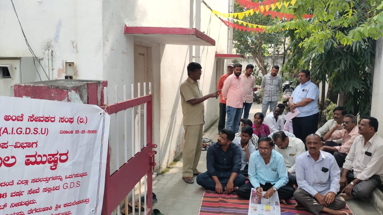 ಅಂಚೆ ಇಲಾಖೆಯಲ್ಲಿ ಸೇವೆ ಸಲ್ಲಿಸುತ್ತಿರುವ ಗ್ರಾಮೀಣ ಅಂಚೆ ನೌಕರರು ತಮ್ಮ ವಿವಿಧ ಬೇಡಿಕೆಗಳನ್ನು ಈಡೇರಿಸುವಂತೆ ಒತ್ತಾಯಿಸಿ ನಗರದ ಅಂಚೆ ಕಚೇರಿಯ ಮುಂಭಾಗ ಅನಿರ್ದಿಷ್ಟ ಕಾಲ ಮುಷ್ಕರವನ್ನು ನಡೆಸಿದರು.ಬುಧವಾರ ಬೆಳಿಗ್ಗೆ ಗ್ರಾಮೀಣ ಭಾಗದ ಅಂಚೆ ನೌಕರರು ಅಖಿಲ ಭಾರತ ಗ್ರಾಮೀಣ ಅಂಚೆ ಸೇವಕರ ಸಂಘದ ವತಿಯಿಂದ ಧರಣಿಯನ್ನು ನಡೆಸಿದರು,ಸಂಘದ ತಾಲೂಕು ಉಪಾಧ್ಯಕ್ಷ ಗೋವಿಂದರಾಜು ಮಾತನಾಡಿ, ಅಂಚೆ ಇಲಾಖೆಯಲ್ಲಿ ಹಲವು ವರ್ಷಗಳಿಂದ ಸೇವೆ ಸಲ್ಲಿಸುತ್ತಿರುವ ನೌಕರರ ಜೀವನೋಪಾಯಕ್ಕೆ ತೊಂದರೆಯಾಗಿದ್ದು, ಈಗ ನಾವು 5 ಗಂಟೆಗಳ ಕಾಲ ಕರ್ತವ್ಯವನ್ನು ನಿರ್ವಹಿಸುವ ಪದ್ದತಿ ಇದೆ. ಅದನ್ನು 8 ಗಂಟೆಗಳ ಕಾಲ ಪರಿಗಣಿಸಿ ವೇತನವನ್ನು ಹೆಚ್ಚಿಸಬೇಕೆಂದು ಆಗ್ರಹಿಸಿದರು.