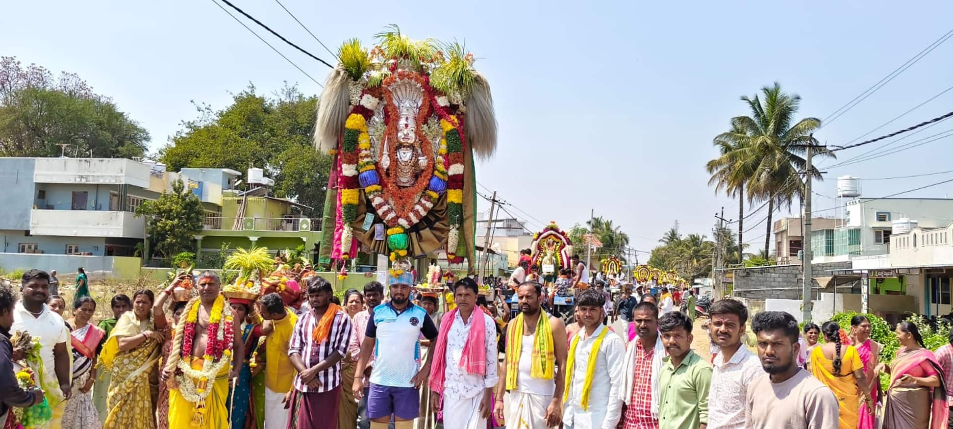 ಬುಧವಾರ ಬೆಳಗ್ಗೆ ಪಟ್ಟಣದ ಟಿ.ಬಿ.ಬಡಾವಣೆಯ ಬಿಜಿಎಸ್ ವೃತ್ತದಲ್ಲಿರುವ ಶ್ರೀ ಗಣಪತಿ ದೇವಸ್ಥಾನದಲ್ಲಿ ಗಂಗಾಪೂಜೆ ಹೂ ಹೊಂಬಾಳೆ ನಂತರ ಪಟ್ಟಲದಮ್ಮದೇವಿ ಪೂಜಾ ಕುಣಿತ, ಮಂಗಳವಾದ್ಯ ಮತ್ತು ತಮಟೆ ಮೇಳದೊಂದಿಗೆ ಶ್ರೀ ಸವದತ್ತಿ ಎಲ್ಲಮ್ಮದೇವಿ, ಉಪ್ಪಾರಹಳ್ಳಿ ಆಂಜನೇಯಸ್ವಾಮಿ ಹಾಗೂ ಪಟ್ಟಣದ ಶಕ್ತಿದೇವತೆ ಶ್ರೀ ಬಡಗೂಡಮ್ಮ ಸೇರಿದಂತೆ ಸುತ್ತಮುತ್ತಲ 25 ಗ್ರಾಮದೇವತೆಗಳ ಉತ್ಸವಮೂರ್ತಿಗಳ ಮೆರವಣಿಗೆ ನಡೆಸಲಾಯಿತು.ಪೂರ್ಣಕುಂಭ ಮತ್ತು ತಂಬಿಟ್ಟಿನ ಆರತಿ ಹೊತ್ತಿದ್ದ ನೂರಾರು ಮಹಿಳೆಯರು ಮೆರವಣಿಗೆಯಲ್ಲಿ ಸಾಗಿದ 25ಗ್ರಾಮ ದೇವತೆಗಳಿಗೆ ಭಕ್ತಿಭಾವ ಸಮರ್ಪಿಸಿದರು. ದೇವರ ಉತ್ಸವ ಮೂರ್ತಿಗಳ ಮೆರವಣಿಗೆ ದೇವಾಲಯದ ಆವರಣವನ್ನು ಪ್ರವೇಶಿಸುತ್ತಿದ್ದಂತೆ ಶ್ರೀ ಸವದತ್ತಿ ಎಲ್ಲಮ್ಮದೇವಿಯ ಉತ್ಸವ ಮೂರ್ತಿಯನ್ನುಸರ್ವಾಲಂಕೃತ ರಥದ ಪೀಠದಲ್ಲಿರಿಸಿ ರಥೋತ್ಸವಕ್ಕೆ ಚಾಲನೆ ನೀಡಲಾಯಿತು. ಸಾಗುತ್ತಿದ್ದ ರಥಕ್ಕೆ ನೆರೆದಿದ್ದ ಭಕ್ತರು ಹಣ್ಣು ಜವನ ಎಸೆದು ತಮ್ಮ ಭಕ್ತಿಭಾವ ಮೆರೆದರು.